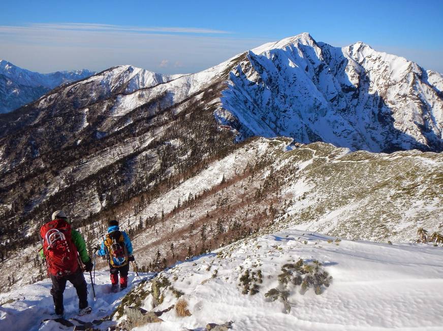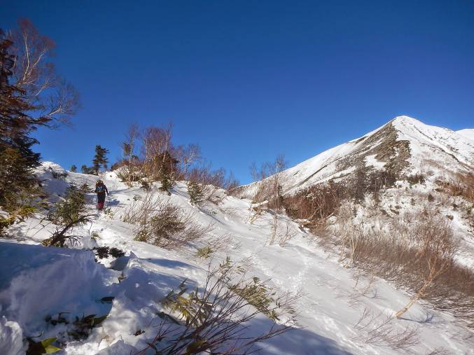 北ア好きとしては、雪山始めにまだ行けていない鹿島槍に行ける!ということで柏原新道をウキウキ出発。赤テープは見過ごしたらしく、若干行き過ぎてしまった感もありつつ、ケルン先の1970m地点から薄藪を漕いで南尾根に入る。今まで積雪20センチくらいの薄かぶりだったのが、南尾根は雪が若干溶け残っている程度。夏道かと見まごうようなジグが切られている。このあたりからJPに至る登りで夏のトレーニング不足を露呈し、遅れを取ってしまった。冬装備が重い・・・。
