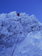 対してこちらは予想通り貸しきり。突風が吹き上げる狭いコルでピナクルにセルフをとりぶら下がってビレイ。寒くて孤独。