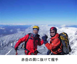 終了点直下なので、そのまま氷化した壁を2m登る。すると終了点に飛び出す。ショルダーピークは今までの烈風が嘘のように無風で、穏やかな日差しに包まれていた。久々に組んだパートナーとしっかり握手。