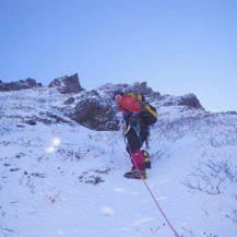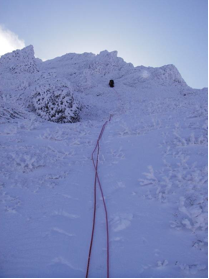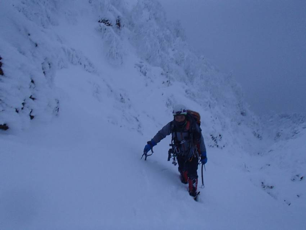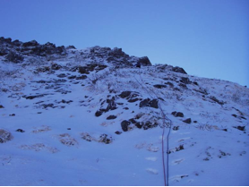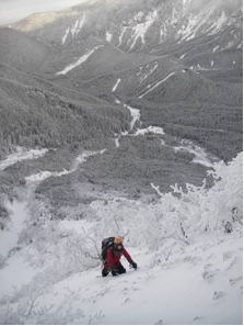 岩のナイフリッジにぶつかり再びロープを出す。ナイフリッジを乗っ越し右手のルンゼへロープを伸ばす。雪は堅雪に変わりアイゼンをきしませ前爪を利かしての登高。支点をとれる潅木、ピナクルが非常に少なくランナウト気味。