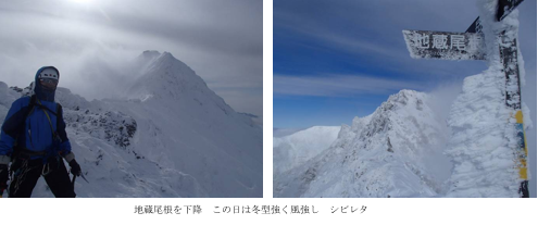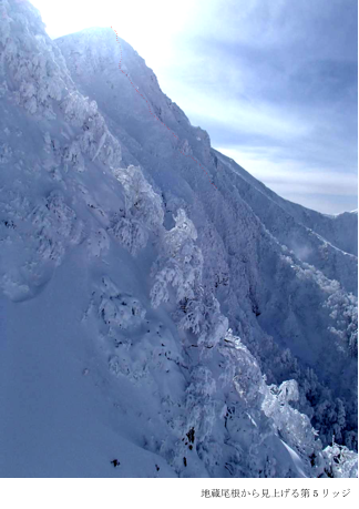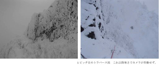 雪壁を5mクライムダウン、3m氷瀑直下でルンゼを横断し、岩壁下部をトラバースして第5リッジに乗り移る。ハイマツを掘り起こしてビレイ点とする。それにしても寒い。雪面に触れると両手がビリビリ痺れるので手袋を厚いのに換える。