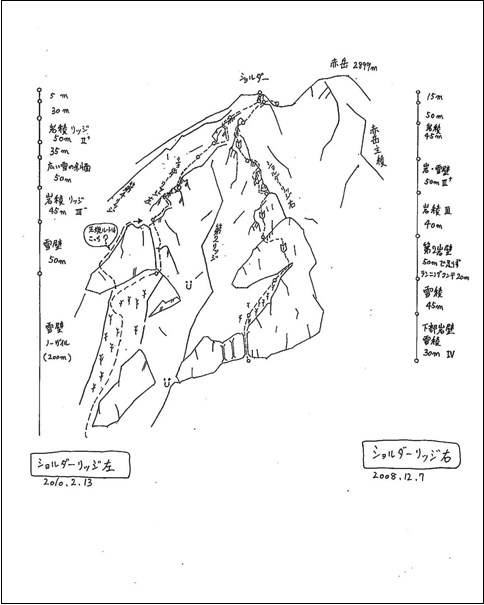単純にしっかりしたルート図や参考になる記録が少ない事、また登山大系を参考にしてもルートの様子やアプローチが不明瞭であり、それらが登攀パーティの少ない要因だと考えられる。逆にこの情報の少なさがショルダーリッジを登る上での楽しみでもあるので、実はここで発表するのも少しためらう。