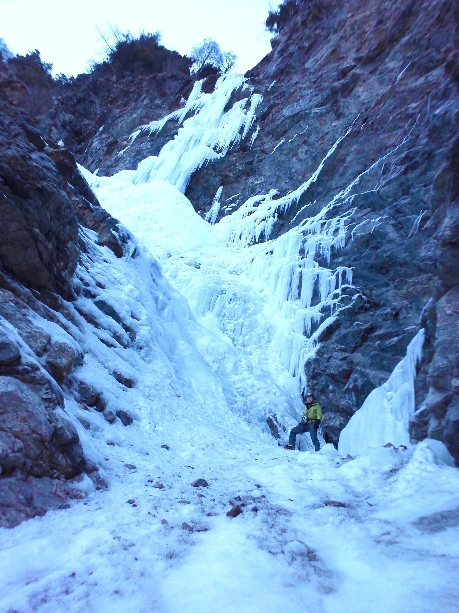 1P目(Y川):8時登攀開始。50mいっぱい左上して氷瀑の左下に着く。Ⅲ