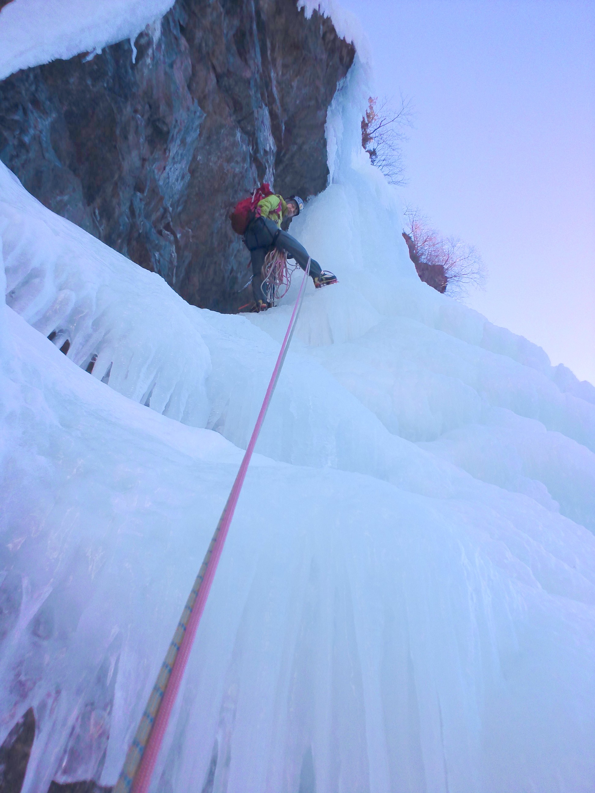 2p目、氷柱にシュリンゲを回して支点にする。50mいっぱい下降して、下の緩傾斜の氷瀑まで懸垂。