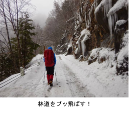 11時前位雨が小降りとなり、いよいよ出発。A久Lのザックがコンパクトであるのに対いて、私のザックは結構大きい。A久Lが林道歩きを突っ走る。あっというまに伊那川避難小屋に辿り着く。うさぎ平から5合目を目指す。林道から登山道に入るところで、ワカンを装着。おー、ワカンの効果を感じることができる。積雪量が増えてきた。この先は15~20分間隔で先頭を入れ替わり、距離を延ばす。