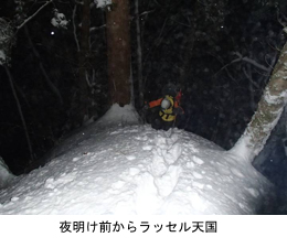 頼りに終点までは30分ほどで登る。トレースがあるとなんて楽なんだろうか! その後急激にスピードダウン。真っ暗な中ヘッデン頼りに黙々とラッセルで上を目指す。ヒザから腰ラッセルで雪も少し緩い。3人で早めに交代を回すが時間が掛かってしょうがない。
