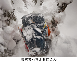 A久さんからラッセルのコツを教えてもらい、少し早く登れるようになったので8合目まで目指すことにする。しかしその先の樹林帯で落とし穴ばかりにはまり全然進まない。8合目まで来たところで今回の最終到達点として本当に敗退決定。あとは来た道を戻るだけ。下りは早く、あっという間に昨夜のテンバを過ぎ、うさぎ平、伊奈川ダムへ下山。