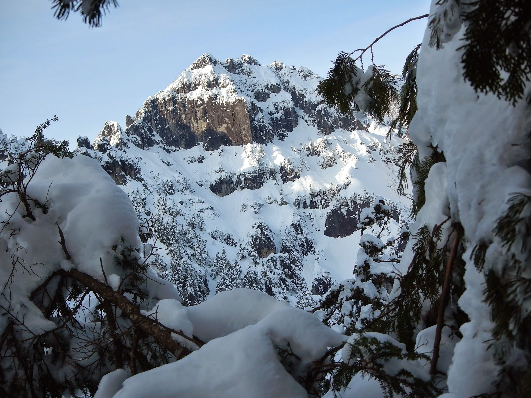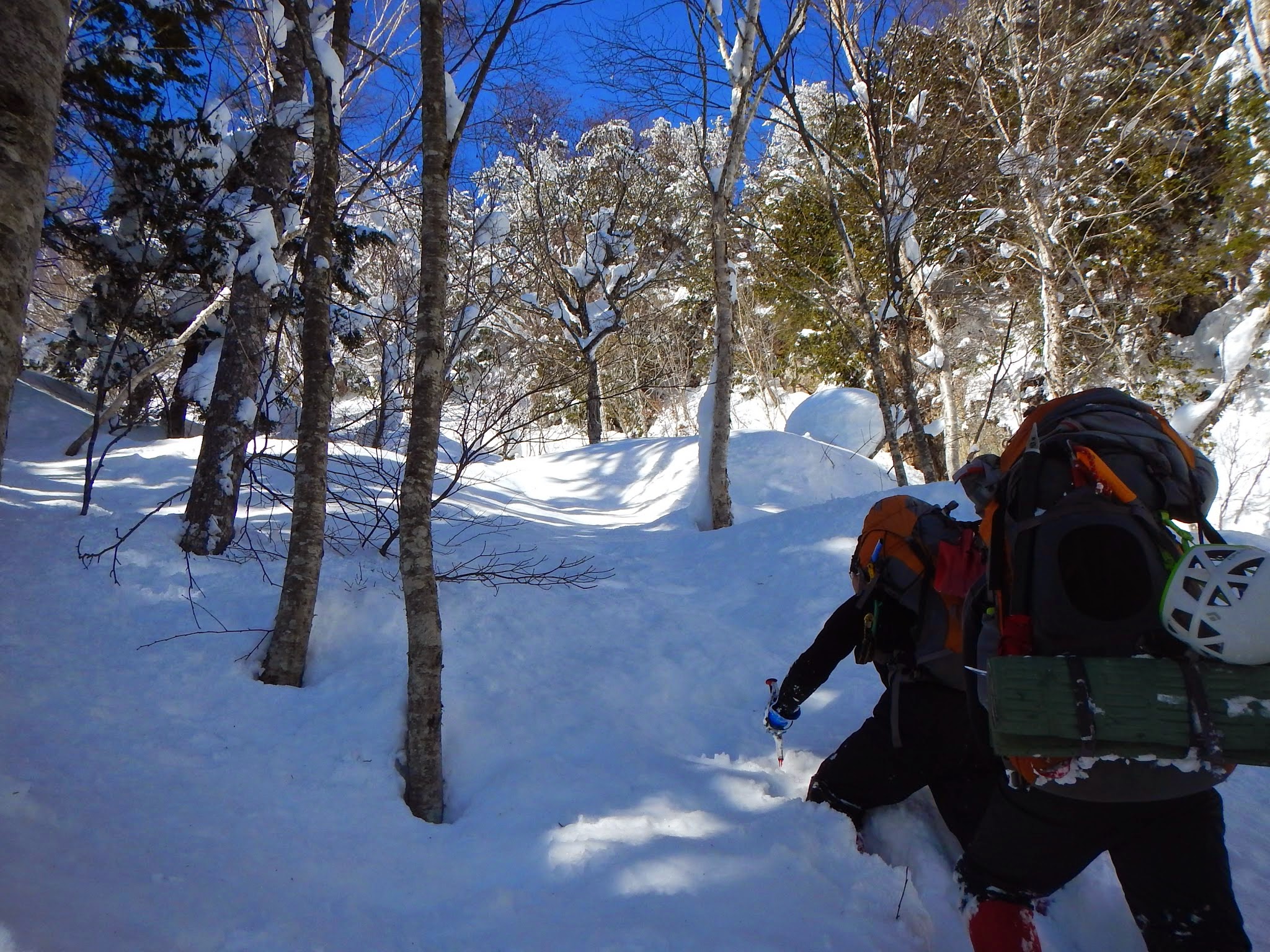 しばらくはマーキングあり。稜に沿って行くが、すぐに側斜面的形状となり傾斜が増していく。幾度となく岩峰にぶちあたるが、都度左側をまくように高度を上げる。雪は膝から腿、ところどころ腰までといった具合の柔雪で、3人でのラッセルではなかなかスピードは上がらない。