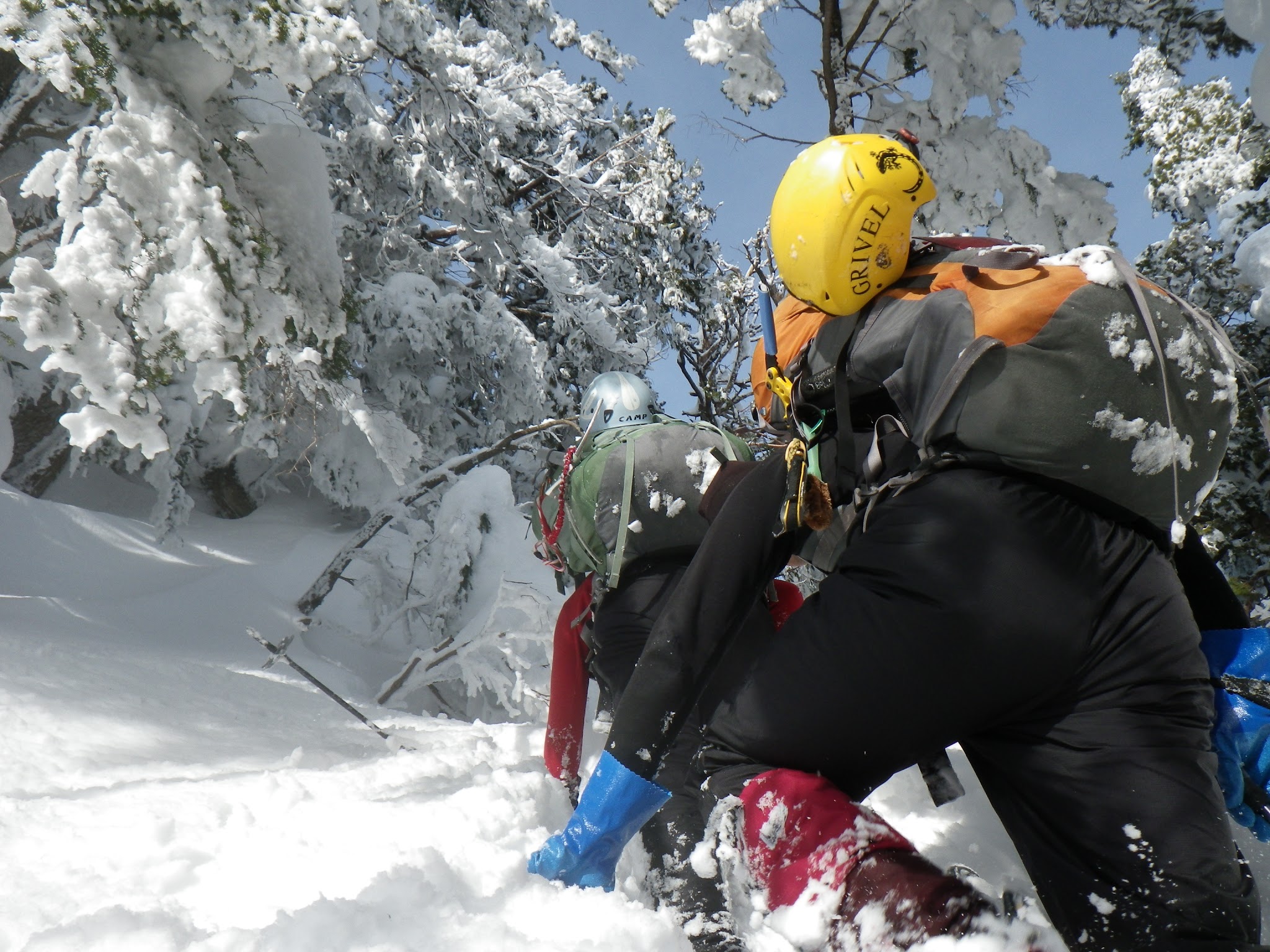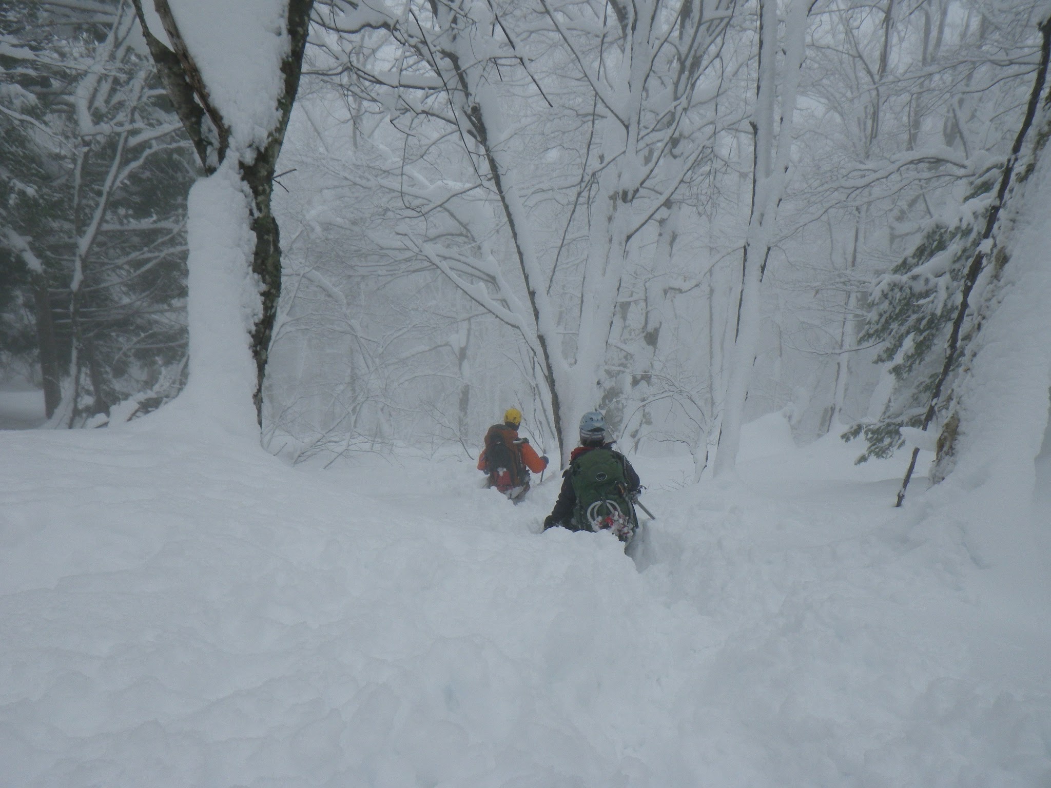 新雪は多く、終始腰まで埋まるラッセル。上部は、マーキングテープを巻きつけながら登高したのでそれを拾いながら下るが、途中で昨日のトレースを見失い、GPSを確認しながら下降路を同定。