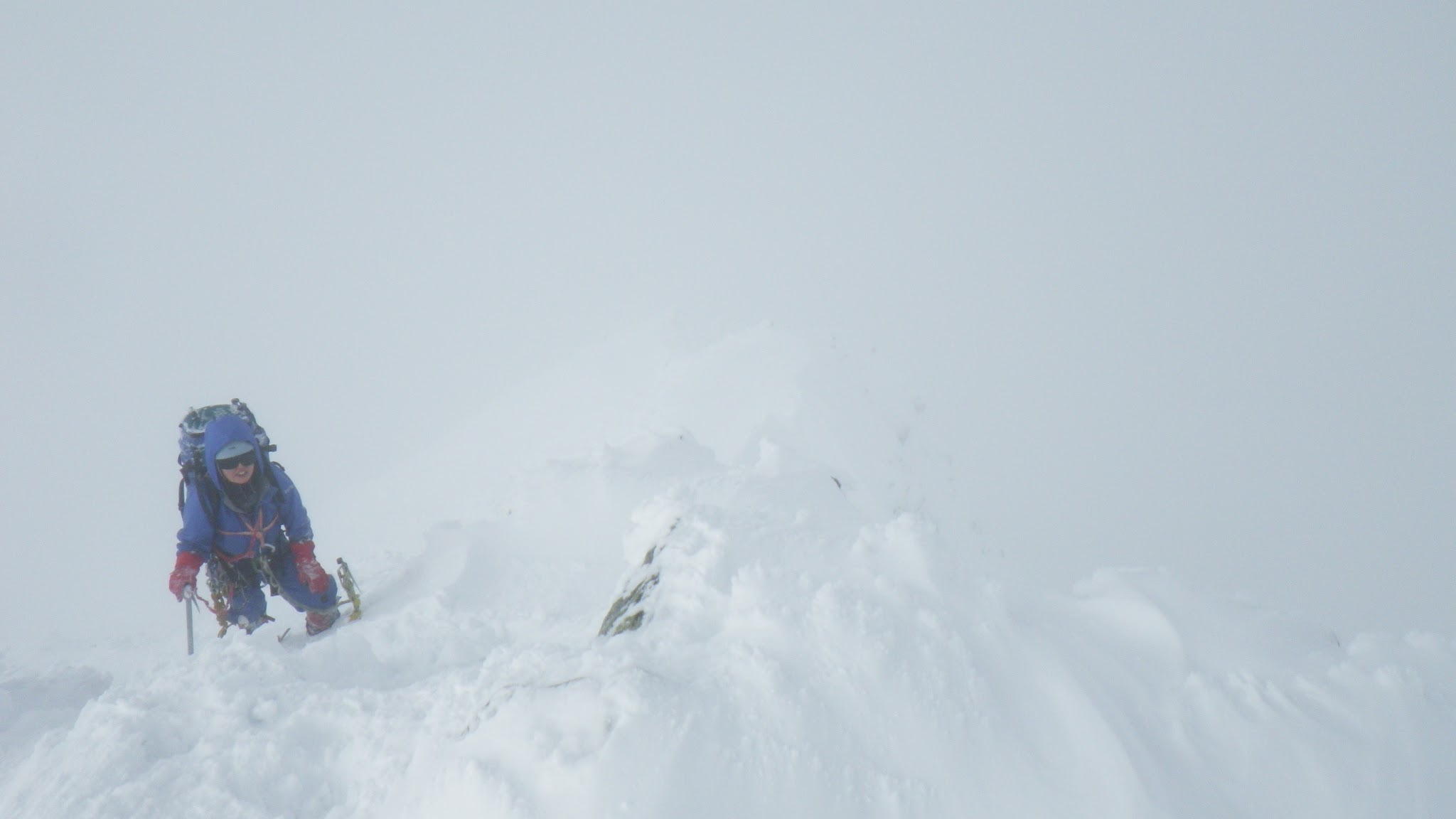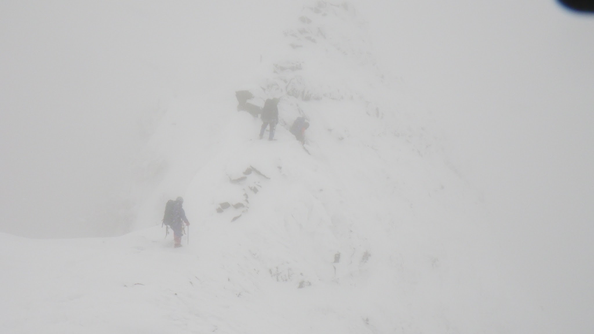 視界のない複雑な稜線を他パーティーの方と声を掛け合いながら微妙に確信が持てないまま辿り、雪壁登攀を続けると山頂に出た。山頂では視界もないのに横になったり、パンを食べたり、みんなで意外にくつろぐ、というか互いにほくそ笑んでる。条件の良い時に穂高に登ったということではなく、条件の悪い時に厳冬期の穂高を味わったというようなもっとおいしい山屋の余韻に浸っていた。