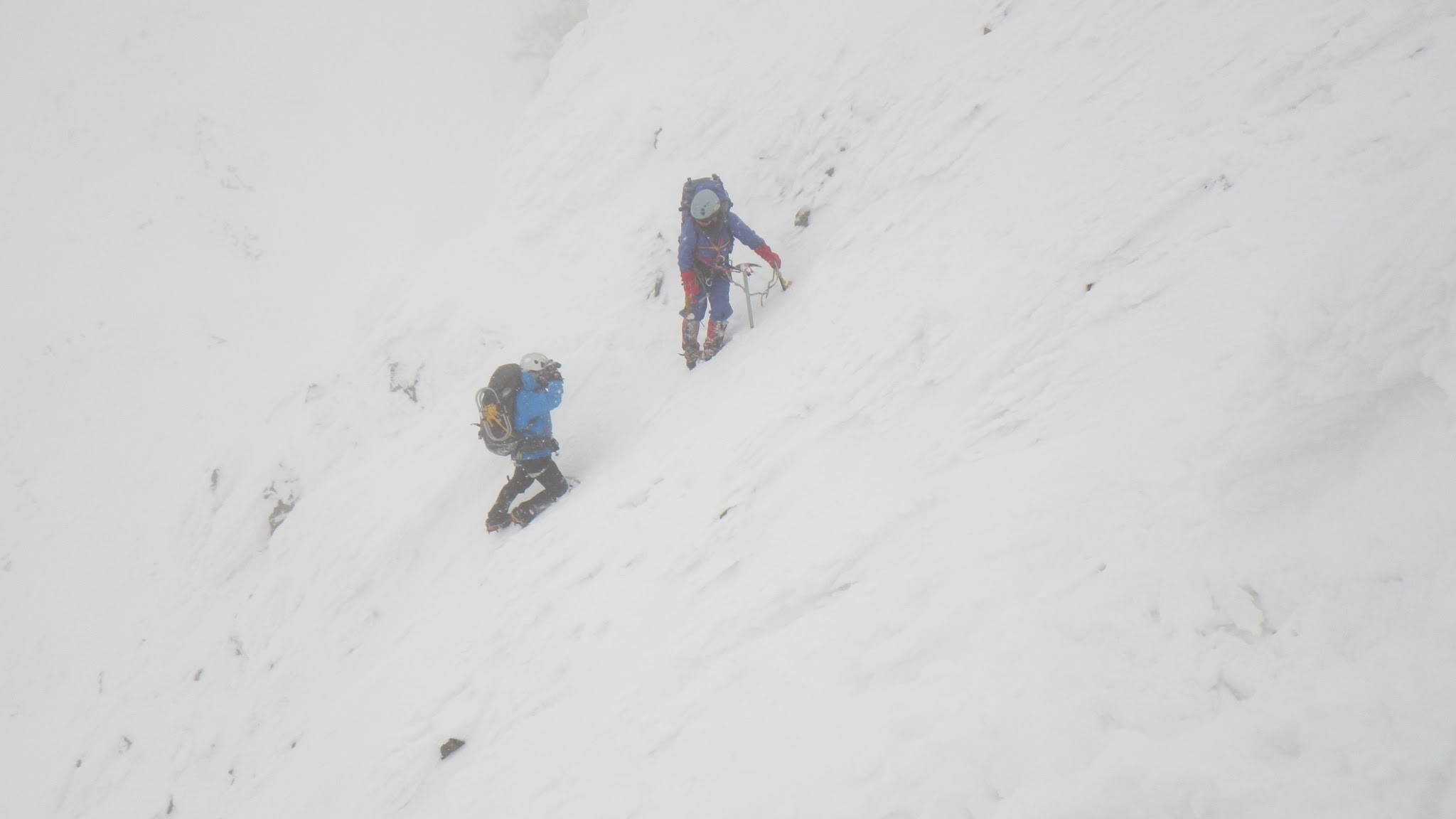 ちょうど森林限界を超え、穂高の鋭利な稜線へと変化が始まる。穂高西面の複雑で鋭利な尾根型、絶え間ない飛騨風、そして昨日の快晴から一転、日差しのない冷え込みとなったため、上部雪稜の雪質は複雑。一昨日の雪が沈降するだけでむしろ登りやすいだろうとの予想は全く外れてしまった。表面上はただの堅雪だが、蹴りこむとクラストが割れて足が抜けるモナカ。フロントポインティング自体難しいホワイトアイスなど。稜を渡るとき以外はすべてバイルを握った四つ足動物となる。