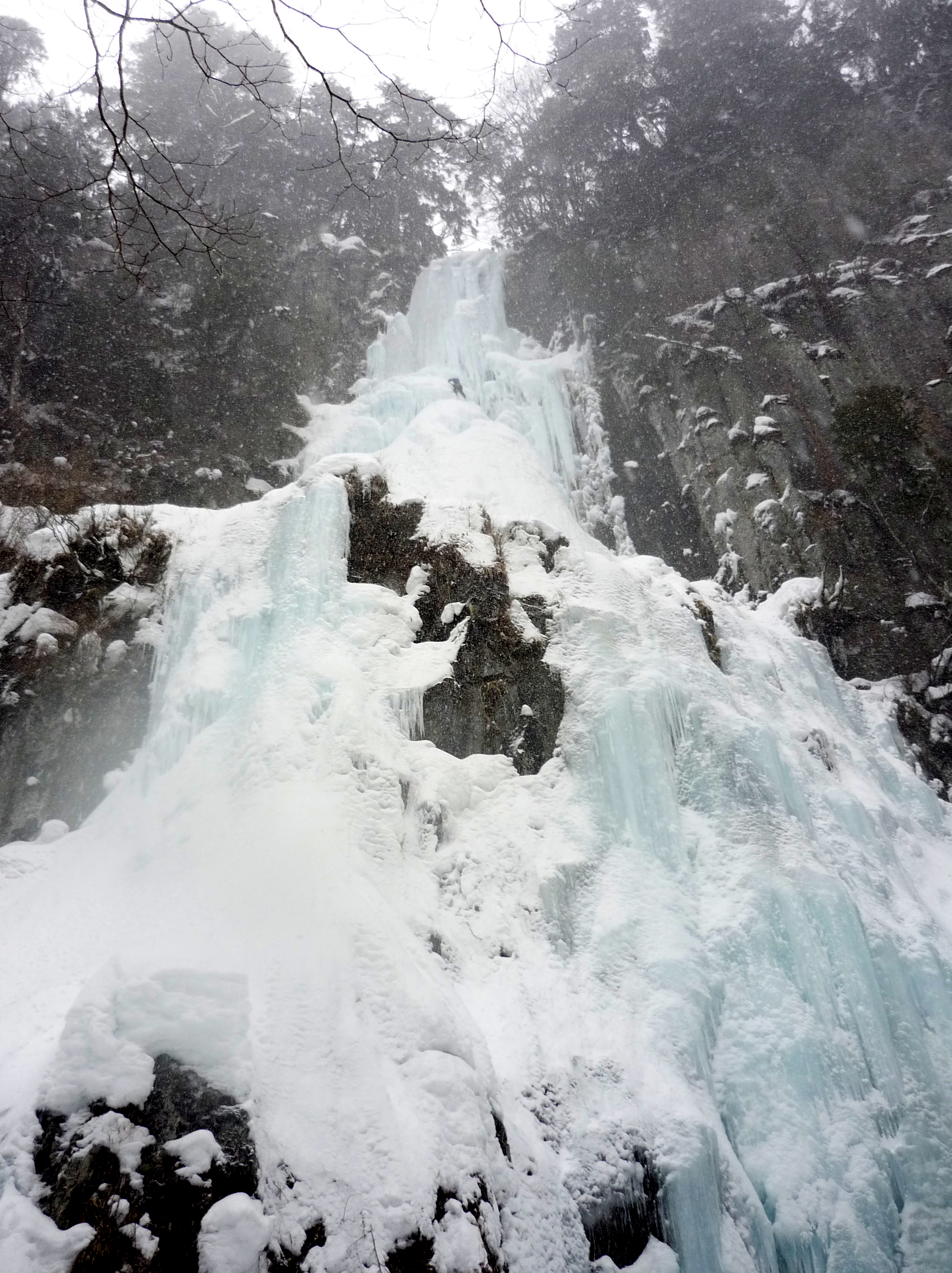青垂の滝(雄滝)は登攀距離にして120m、滝自体の高さは100mと思われます。技術的なグレードは5級ですが、結氷状態が特異でグレード以上に精神的な重圧があるのが30年以上前に初登りされて以来再登がされていない理由かも知れません。特に雪のつき方によっては2ピッチ目の雪壁登りが核心になる可能性があります。
