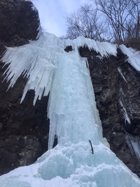 1P目 T濱リード。登り始めが垂直で核心。だだ、バイルの跡やスタンスが豊富にあり体感Ⅴ級‐ぐらいだろうか。しかし、アックステンションなしに2本目のスクリューをセットしようとして手がすべり落としてしまい、以降、フリーは諦めてアックステンションでスクリューをセットしながら登る。弱い自分。40mくらいロープを伸ばしたところの緩斜面でピッチを切りスクリュービレイ。