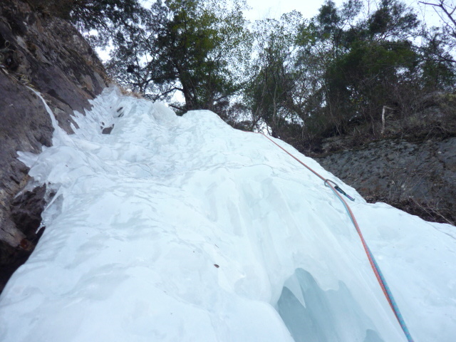 特に3ピッチ目は5級以上のグレードが40m以上続きますので、たとえば先週登った犬殺しの滝等よりはるかに体力的に厳しく、わたしもフォローしながらテンションの誘惑に駆られました。その意味でこの滝の核心は3ピッチ目と言えるかも知れません。少なくとも今の氷結状態ではそう言えます。
