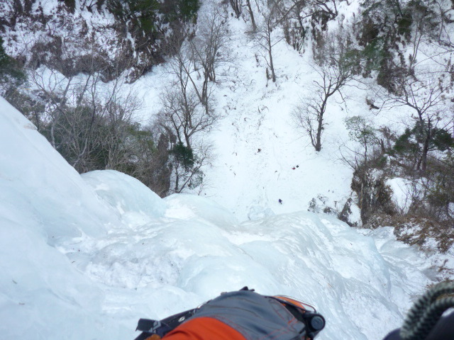 先行パーティーが疲れて登攀続行が困難になってしまったのを見ても分かる通り、この滝を登るには5級プラス以上をリード出来る技術と50m一杯、ずーっと5級クラスの氷壁が続くピッチを登り切りる体力と持久力が必要です。