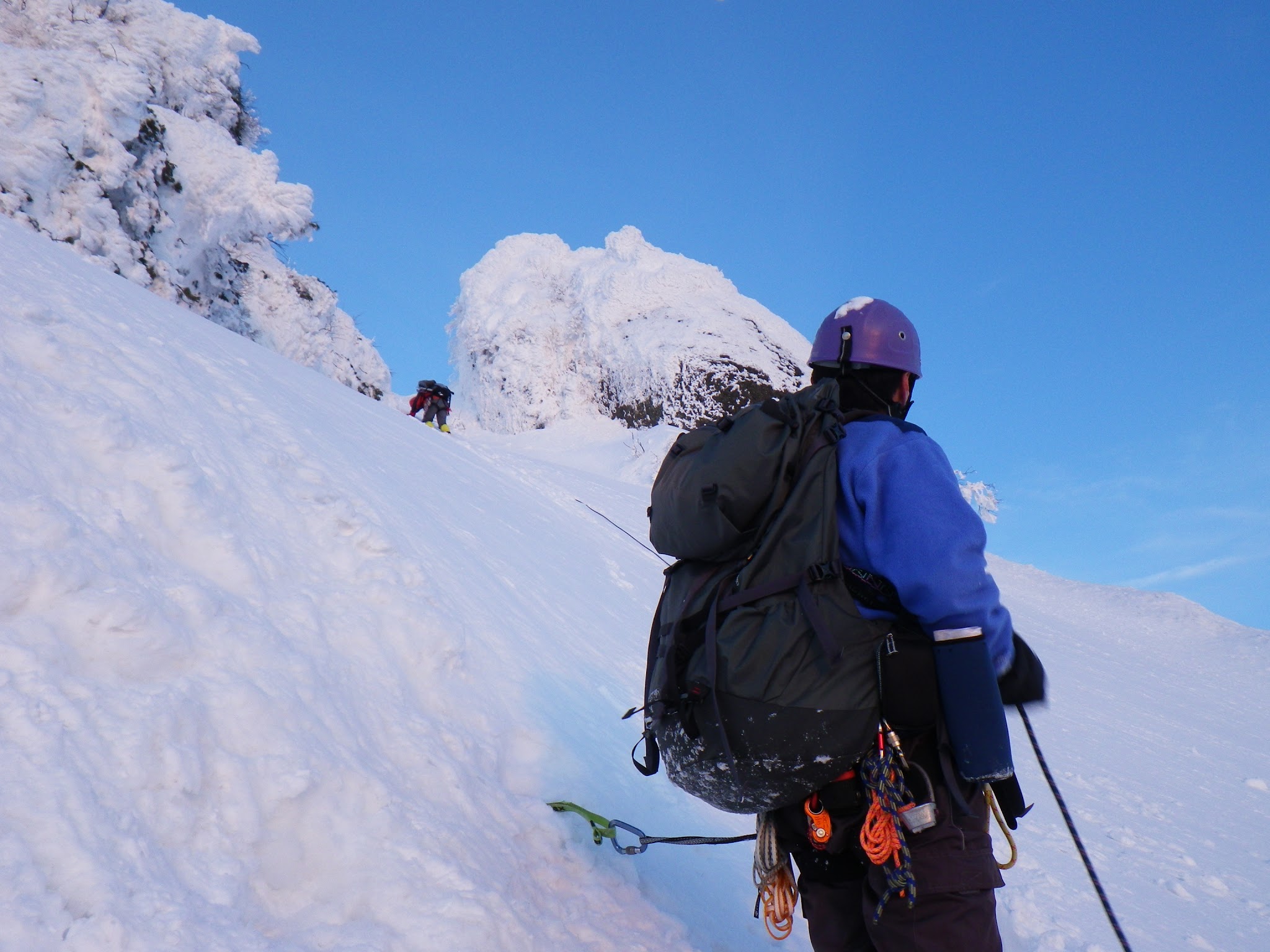 下りは稜線直下でロープを使用。