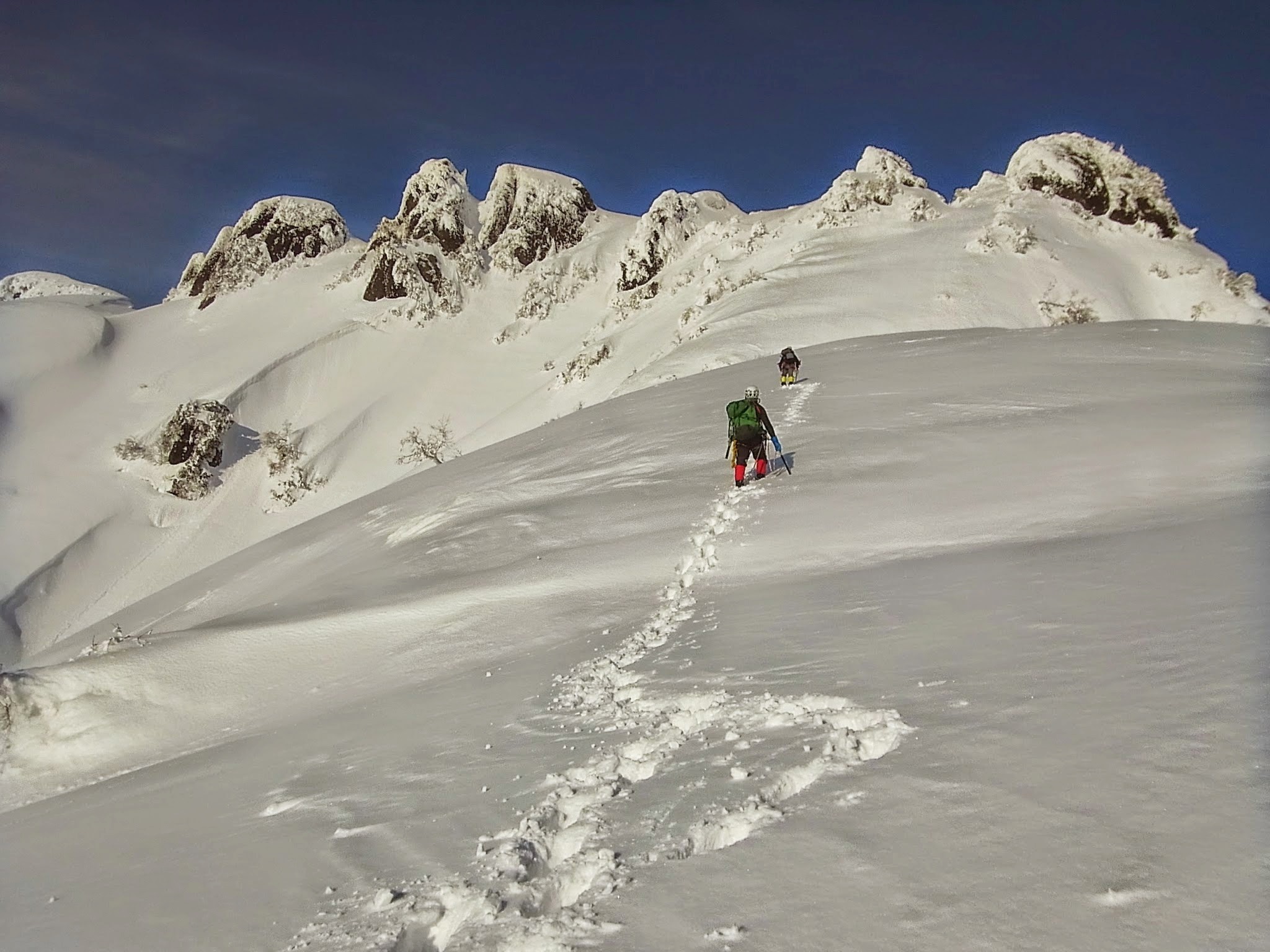 夜からかなり風が強くなり、テントが叩かれます。外でカラカラと音がするので見ると、ペグ代わりのスノーバーが抜けて風であおられていました(この時フライに当たり、フライ末端の一部を損傷、現在修理中)。外に出てテントのアンカーを取り直し、何とか朝まで持ってくれました。翌朝は朝食も取らず、テルモスのお湯だけ飲んで早々に撤収。下り始めれば、あっという間でしたが、相変わらず風は強い状態でした。
