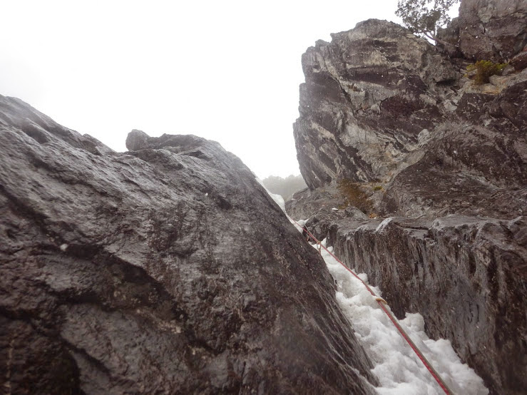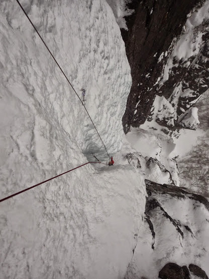 選手交代でM藤リード。クラックを登り返す。滴る水に手が凍てつく。ルンゼの氷上に達する。ここから上部は更に氷が細い。ベルグラが岩から浮き、その上に溶けかかったスカ雪が乗っている。悪い。気温が高すぎるのだ。戻って岩壁を行く選択肢も考えたが、アイスクライミング的には、岩に逃げたことになる。