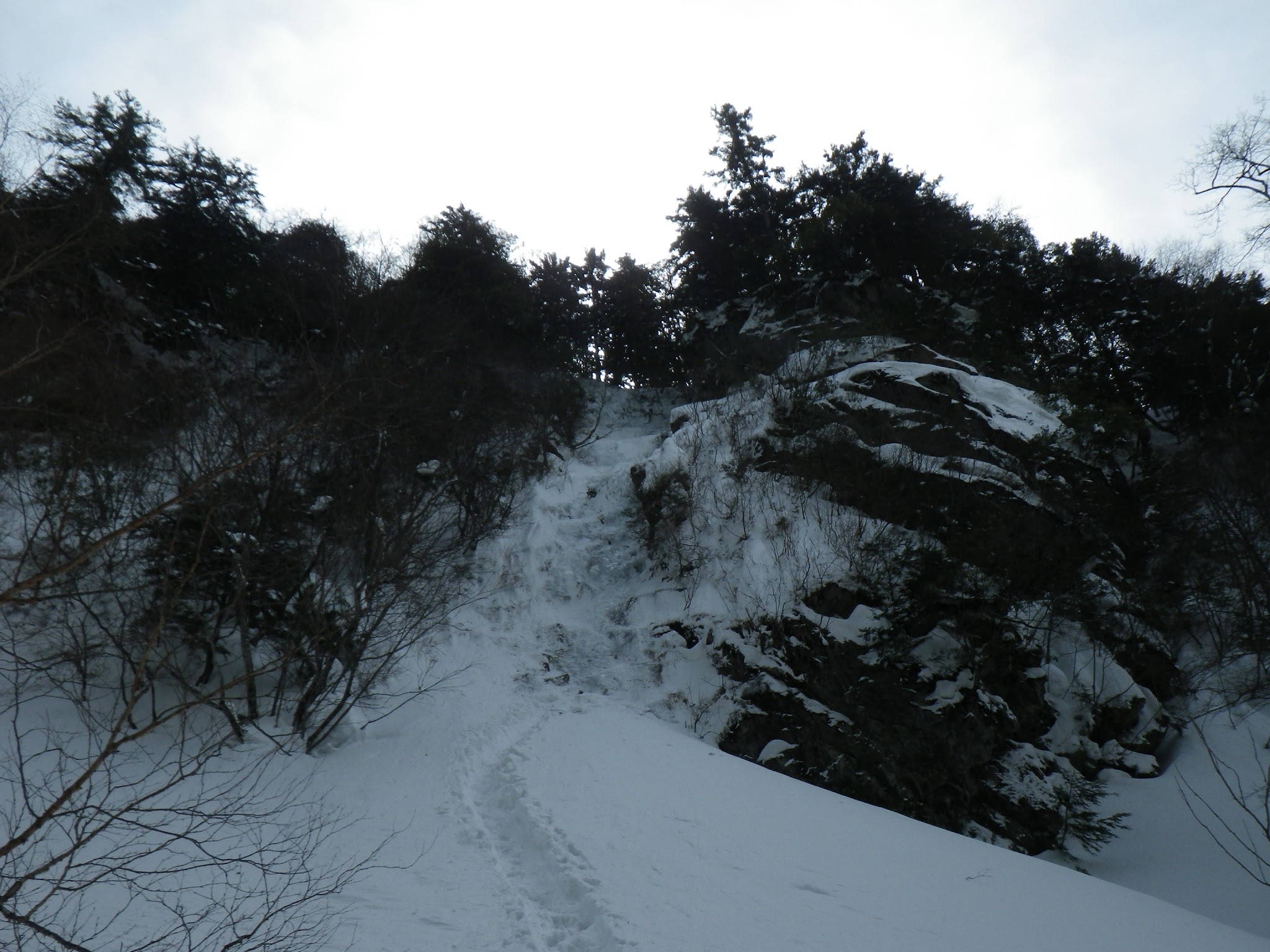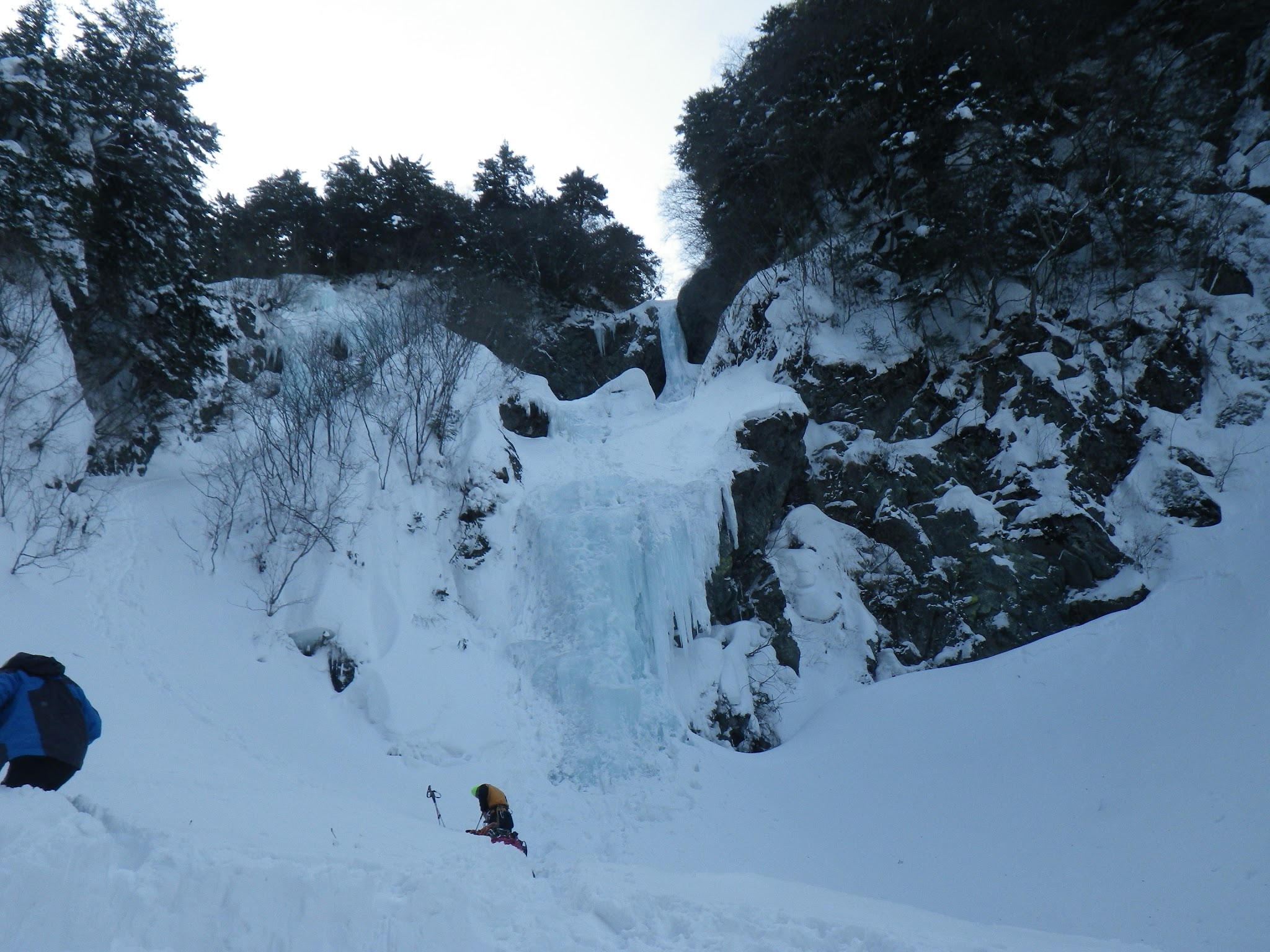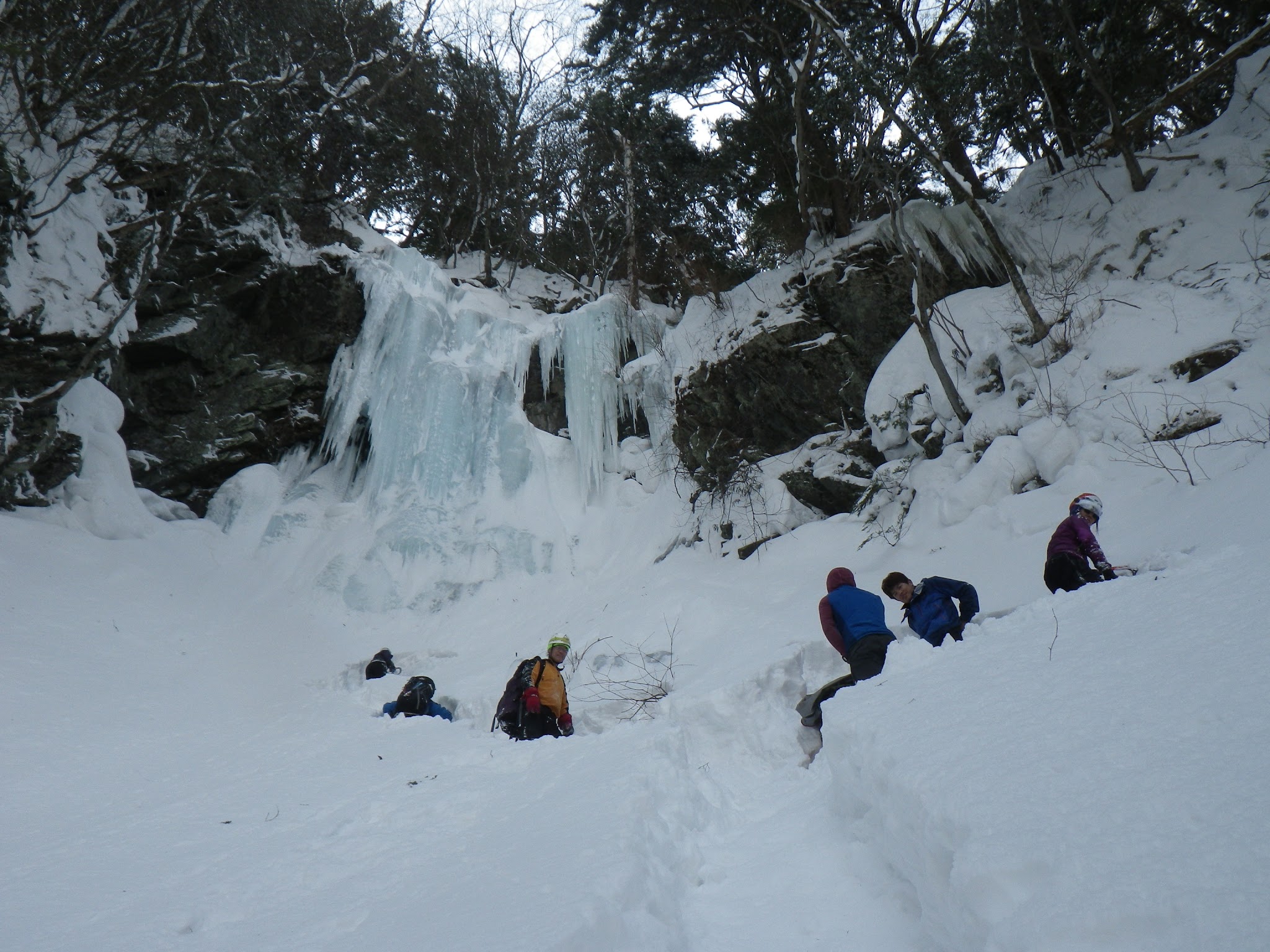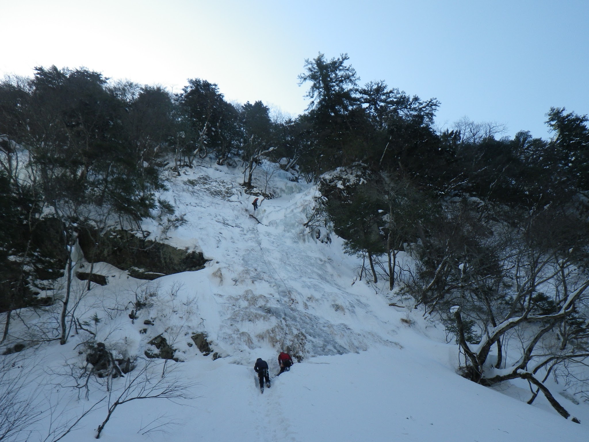 今週は5パーティー30人弱いましたかね。アプローチの大岩は我々のみ右の沢通しに行きました。他のパーティーは左のルンゼ状へ。他のパーティーをようく眺めると、ラッセルが先行パーティーの5人ぐらいしか回ってないような…。側壁の雪崩が怖いというよりもむしろ、ラッセルの代わってもらえなさのほうが見ていて辛いというか、怖かった感じです。