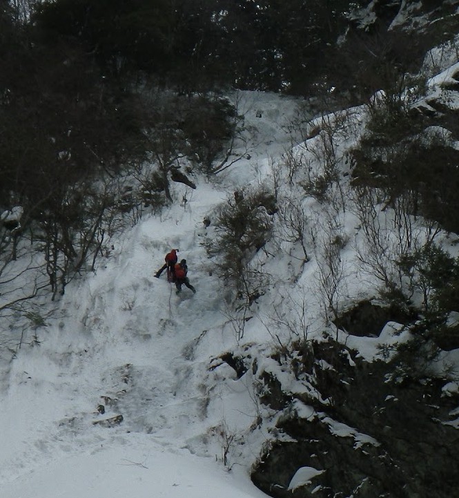 KC(米国人、来日8年目)「日本語もかなり上達したことと存じます。今登攀では進行が慎重に過ぎスクリューが足りなくなってしまいました。I籐様をはじめ、TM様におかれてもご迷惑をおかけすることになり誠に申し訳ございません。現在、沢中下部15mあたりのところでスタックしておる次第ですが、何卒ご高配のほどお願い申し上げます」