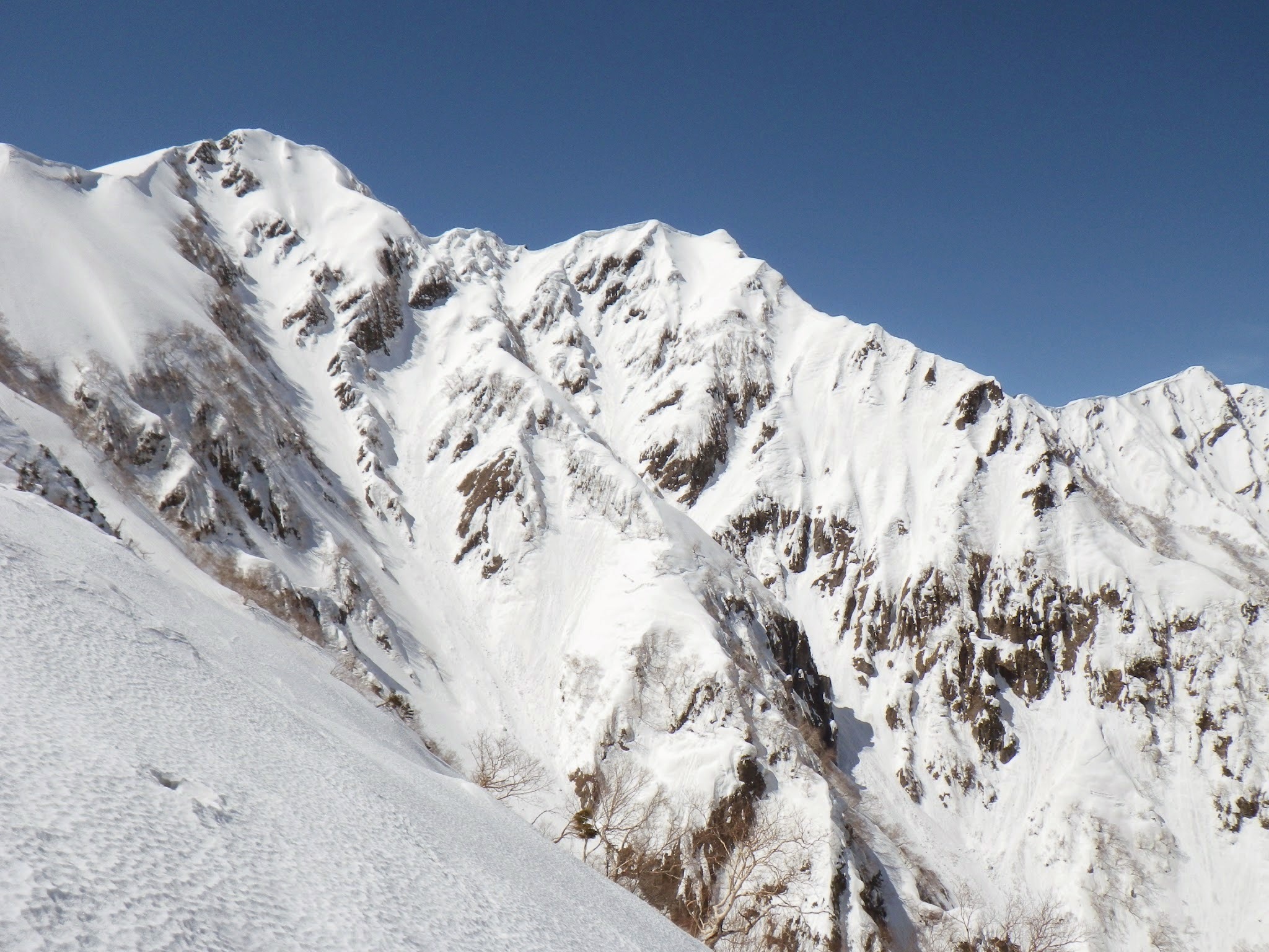 順調に下山していくが、急登まで下ったところから昨日の高温でかなり雪解けが進み、土が露出している部分が増えていた。ここで、五竜Pもまもなく下山との連絡。温泉で合流することとなった。