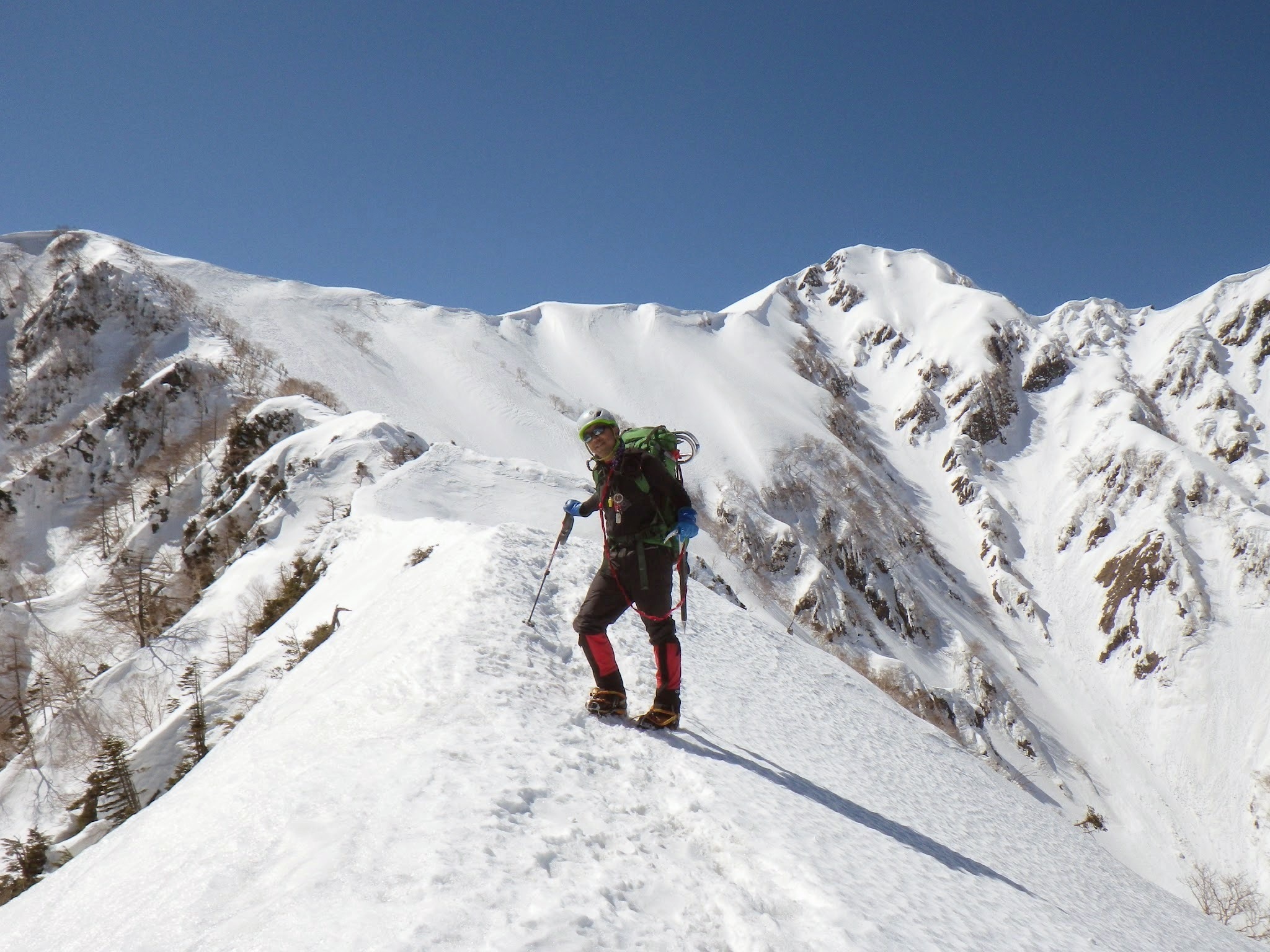 P2のナイフリッジもトレースばっちりで特に危険は感じない。3mほどの下りも隣に立木があり、きちんとバックステップで降りればOKと判断し、ロープは出さずに通過。