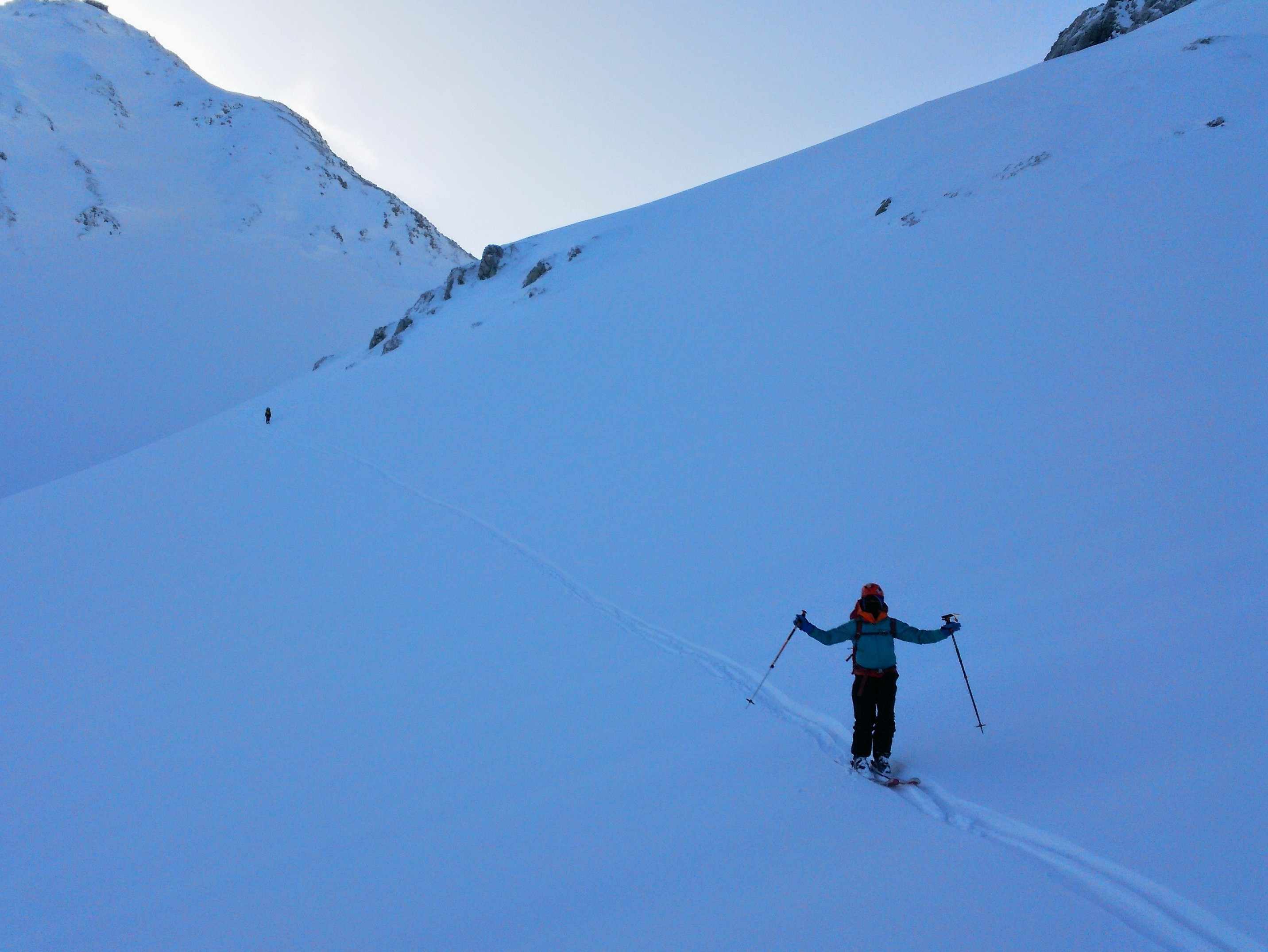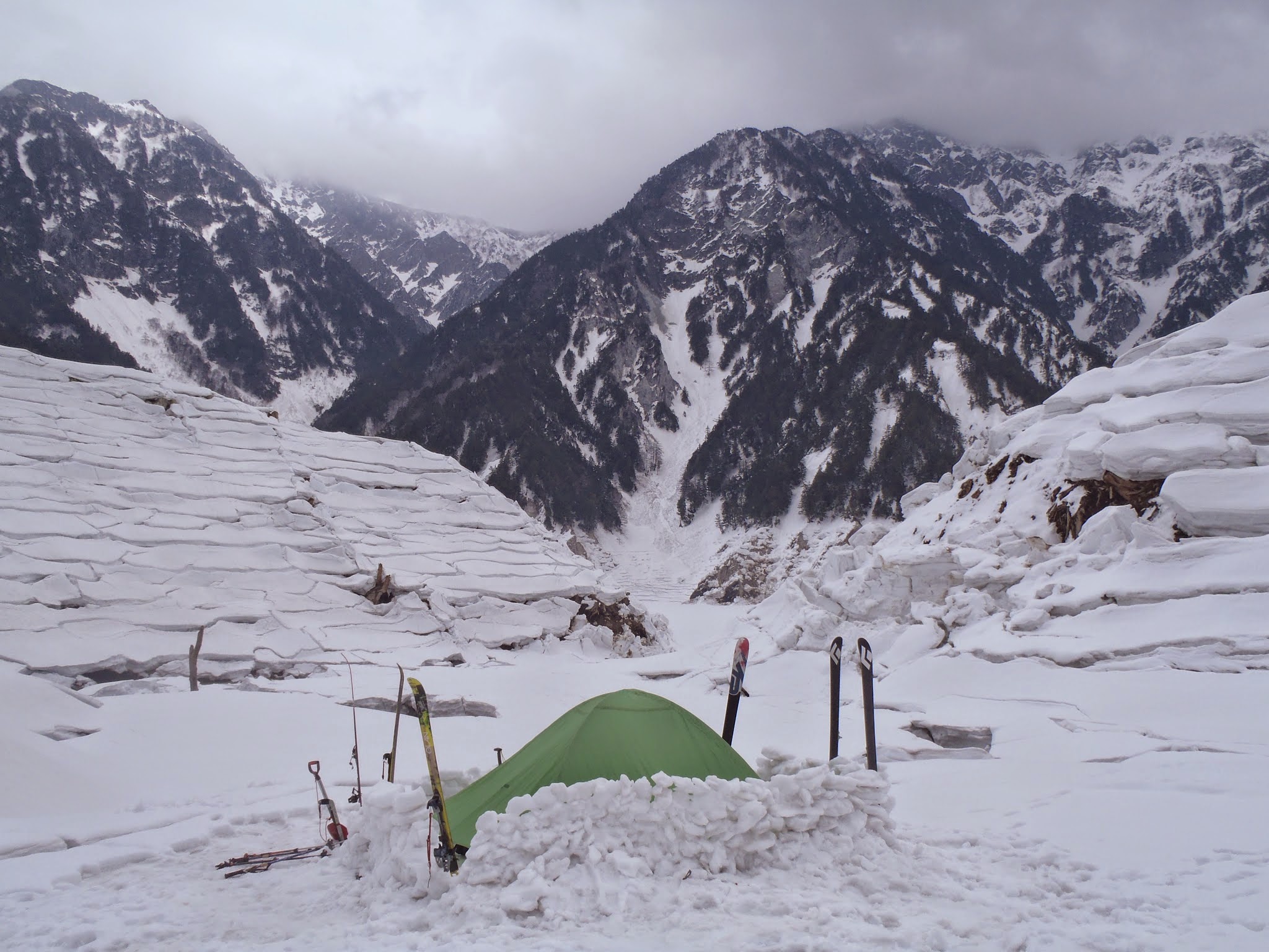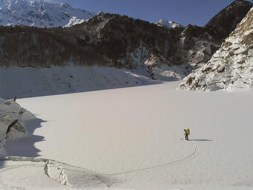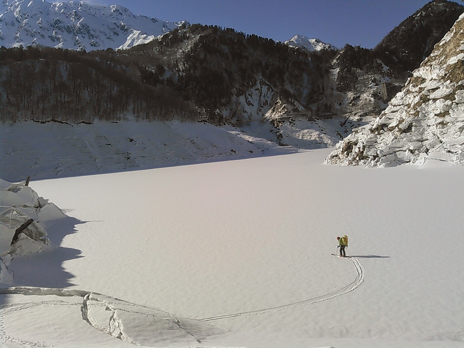 まぁまぁな雪質の斜面をどんどん落としていく。核心?の滝は左岸側のルンゼというか斜面にバケツレベルのトレースがあってアイゼンなしで登り、隣の沢をスキーで落とすとほどなく黒部湖。