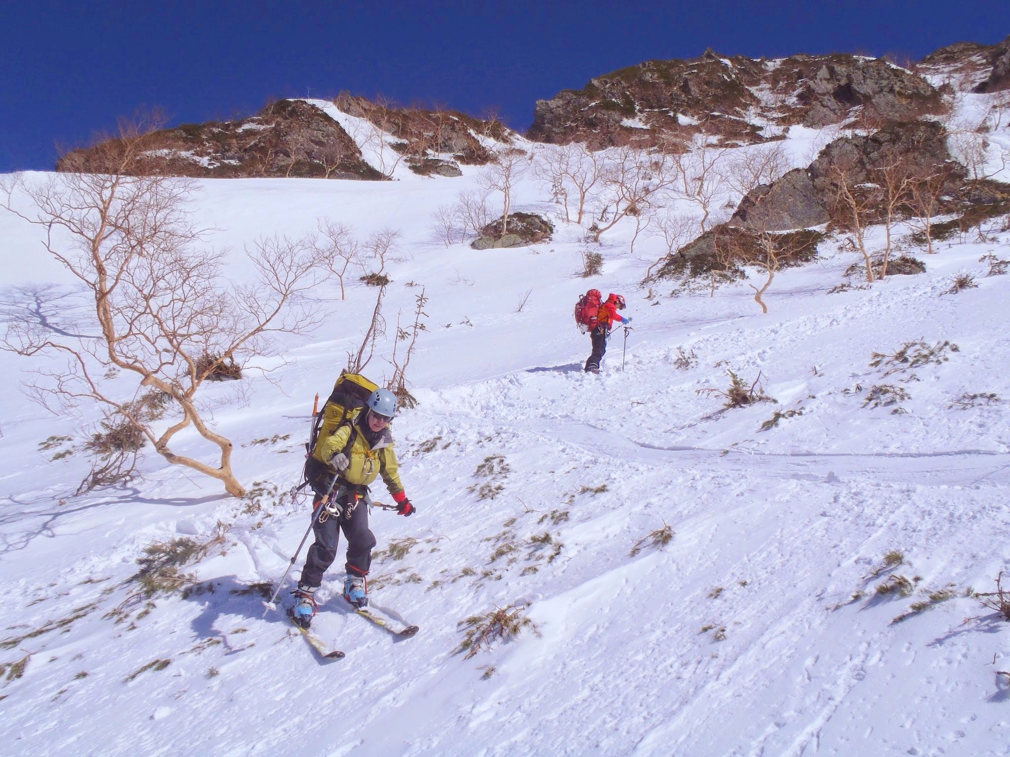 大スバリ沢はハイマツやら岩やら色々出ていてすぐは滑れず、山頂からおおよそ300mほど落としてから雪が繋がり始めようやくスキーを履く。
