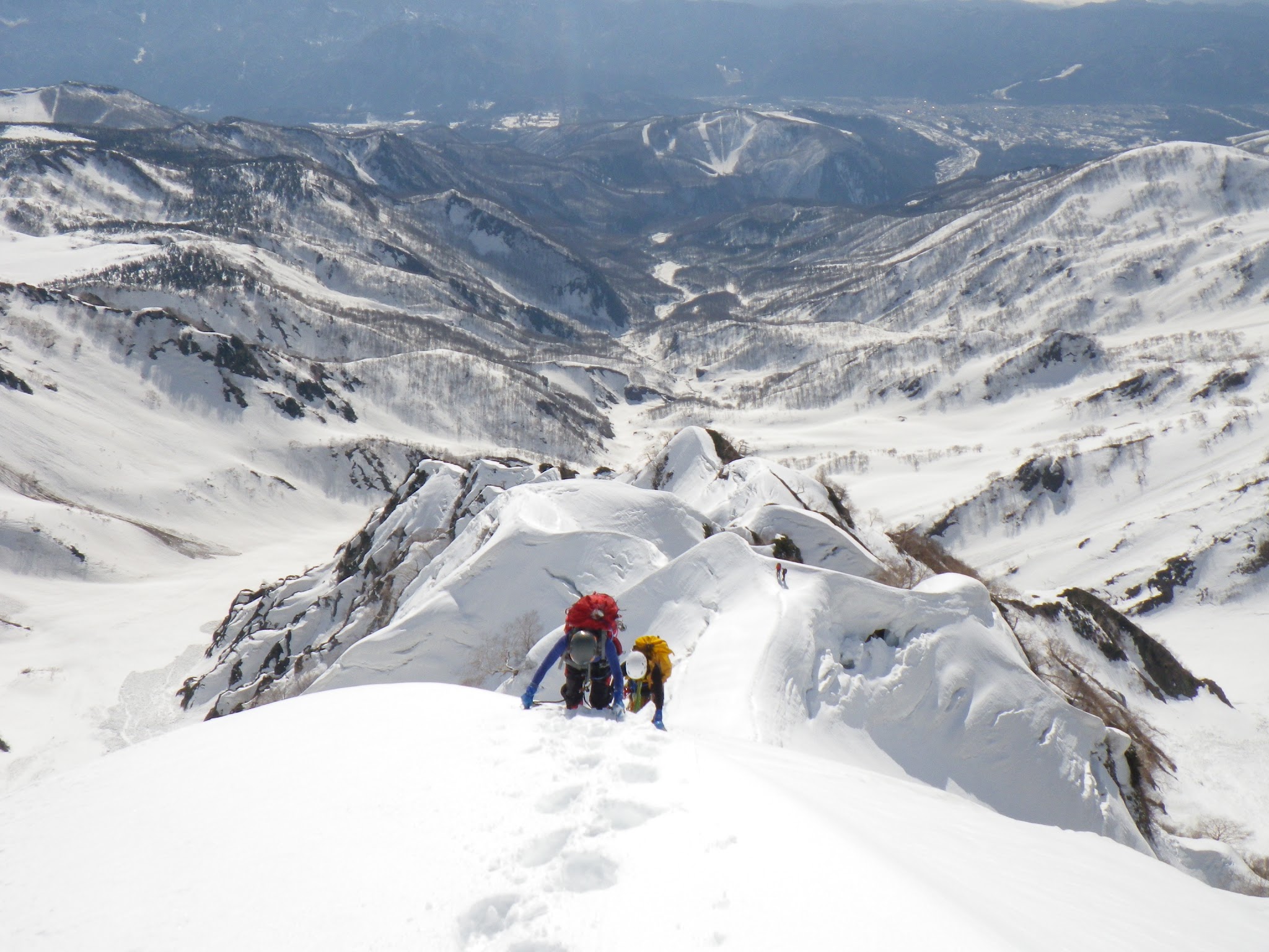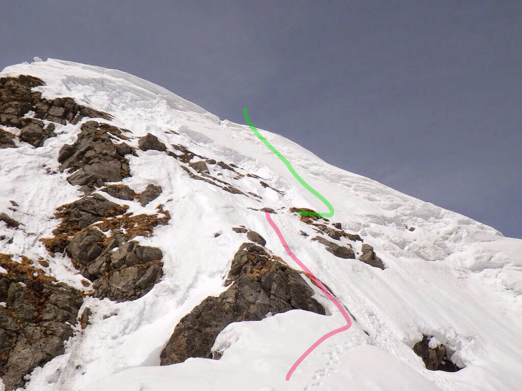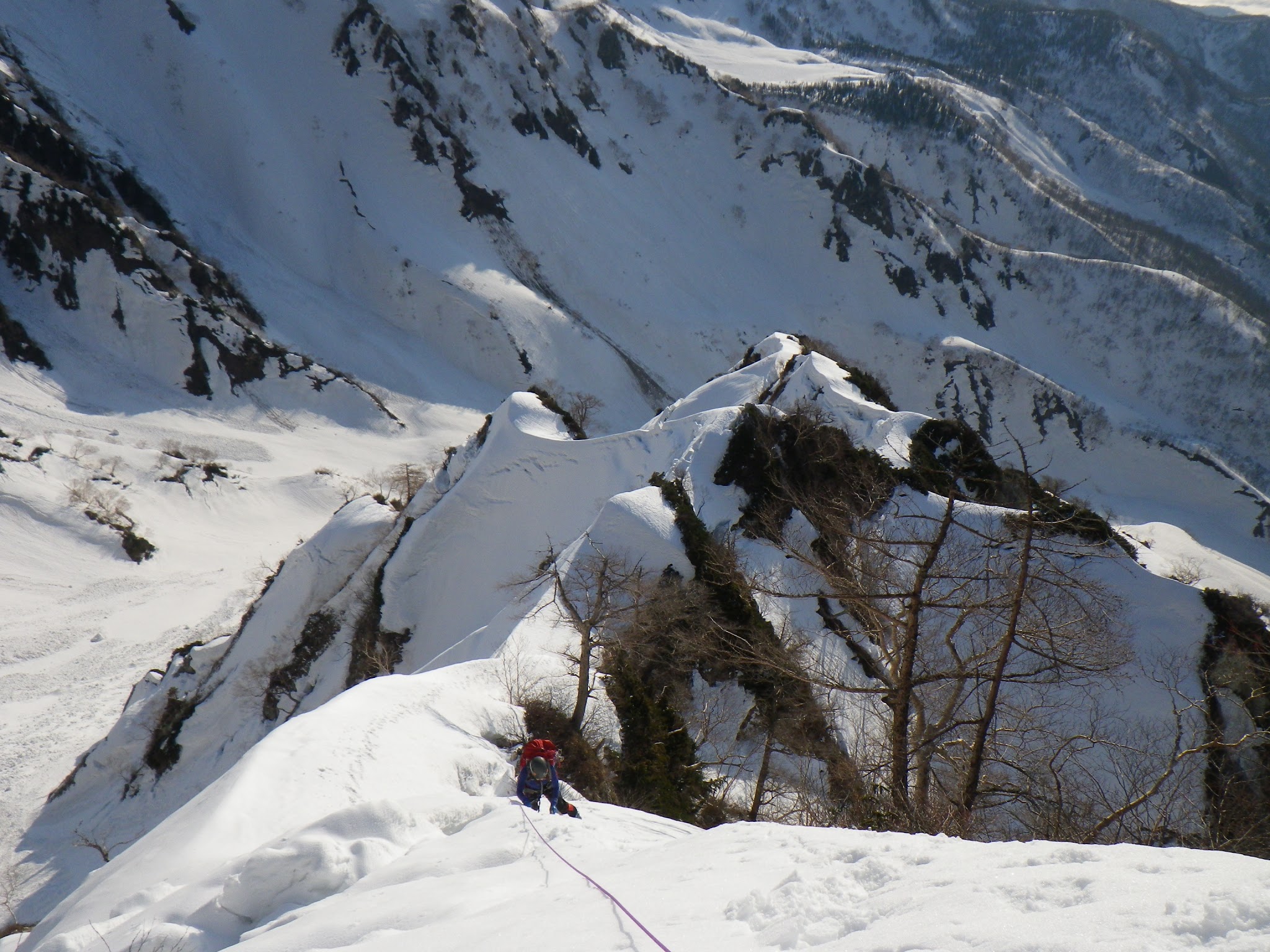 振り返ると、ギザギザの稜線。ダガーポジションでの雪壁登りがアクセントになる。今年は雪が少ないらしく、岩が露出しているところもあった。岩は脆く傾斜もあるが、丁寧に見ればホールドはあった。雪庇もなかった。
