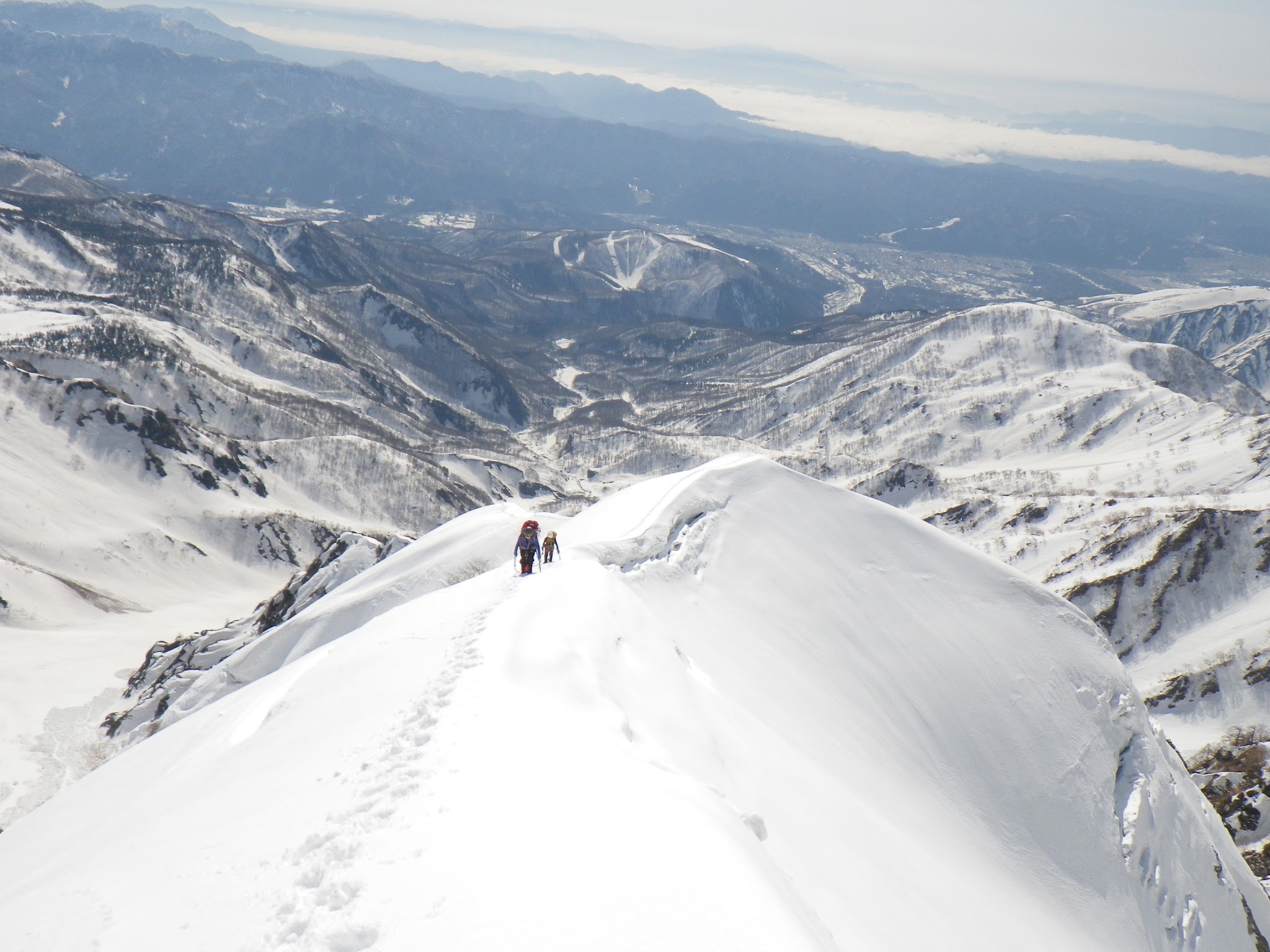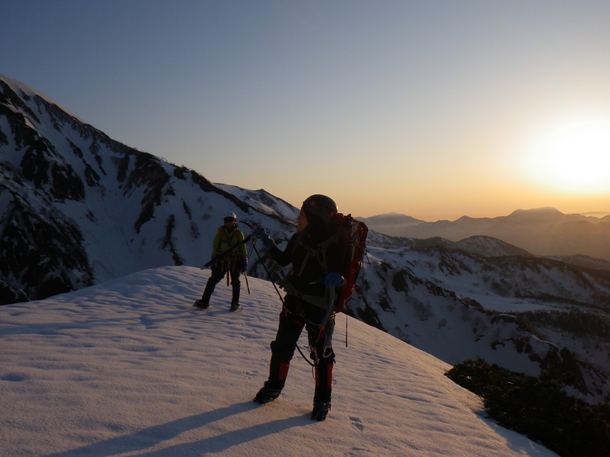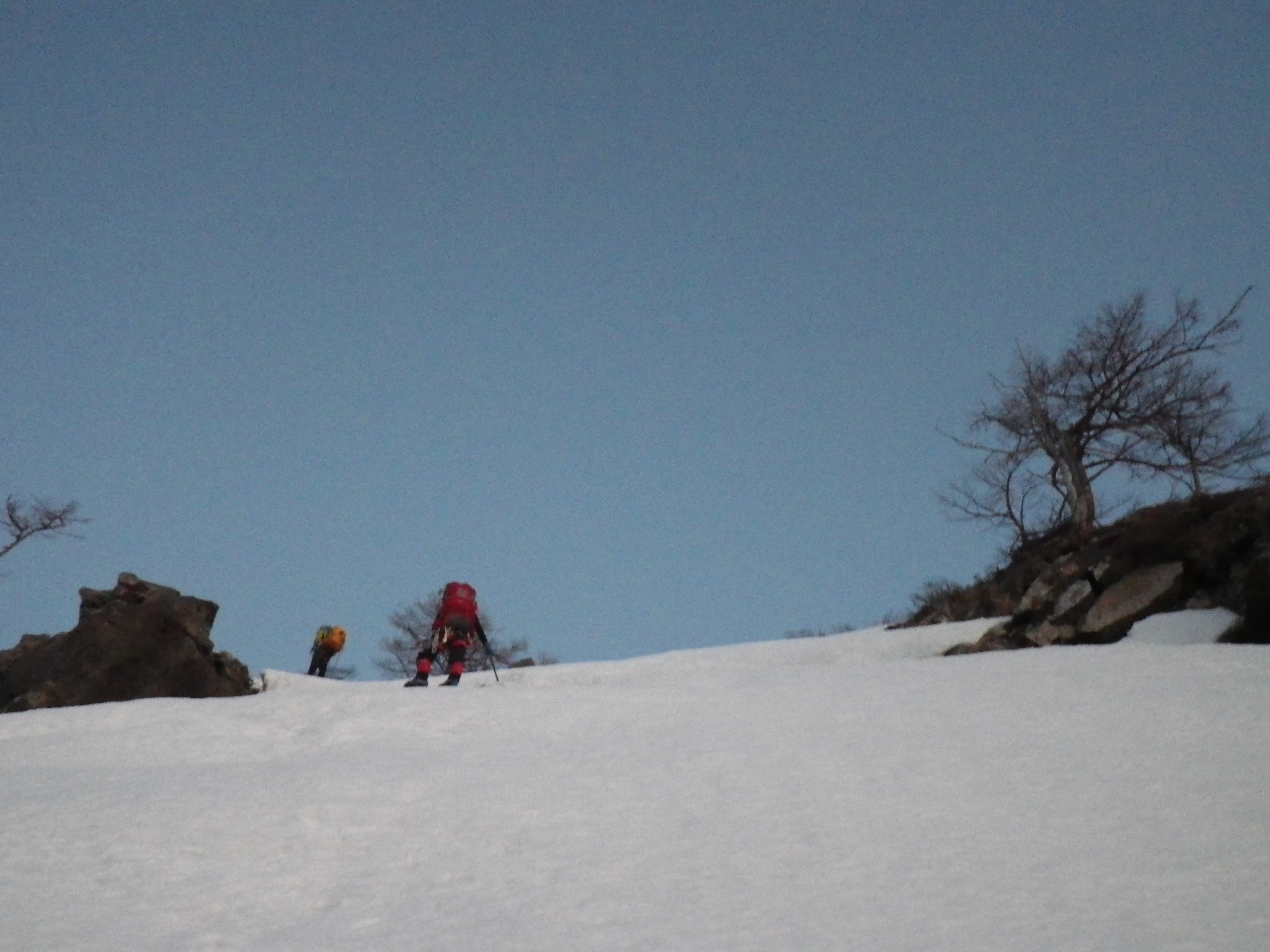 振り返ると、ギザギザの稜線。ダガーポジションでの雪壁登りがアクセントになる。今年は雪が少ないらしく、岩が露出しているところもあった。岩は脆く傾斜もあるが、丁寧に見ればホールドはあった。雪庇もなかった。