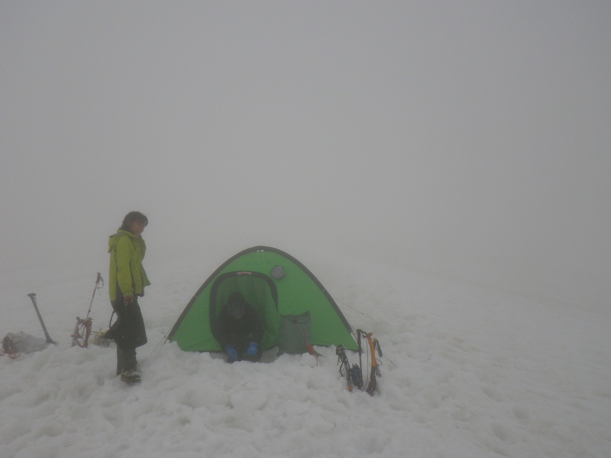 白馬に到着すると、雨は上がっており、青空も見えるものの、山は雲の中。白馬尻は完全なホワイトアウトなので慎重にテン場を決める。ガスが晴れれば取付点の確認をしたいのでたびたびテントの外を見るが、ますます白くなるばかり。