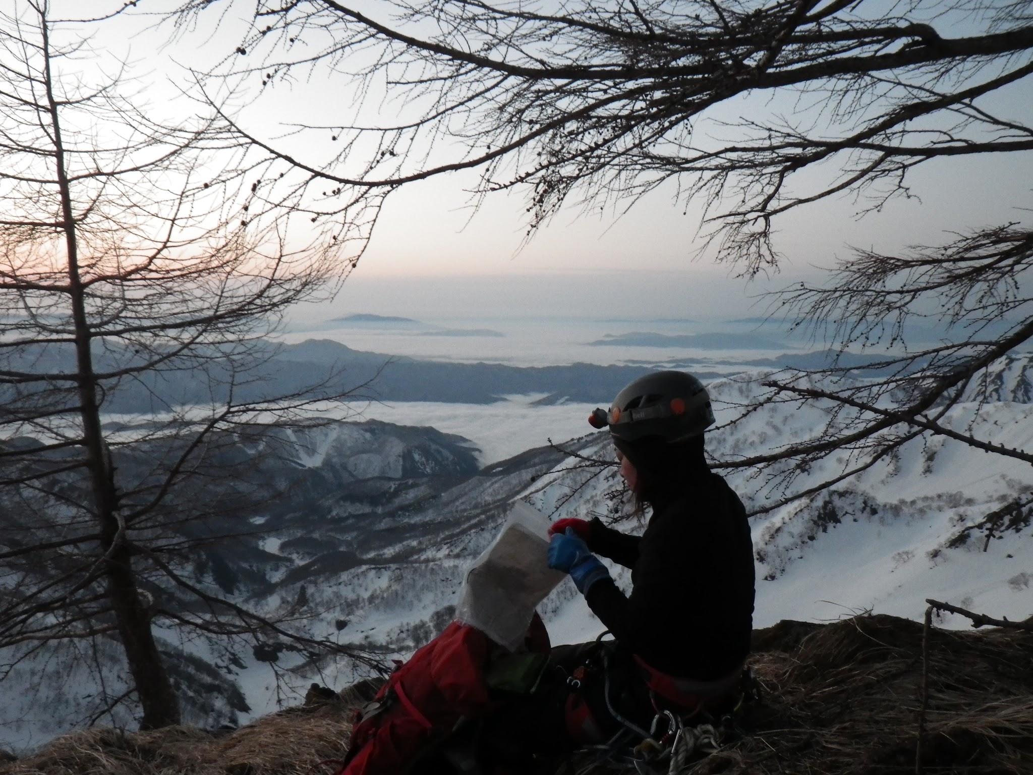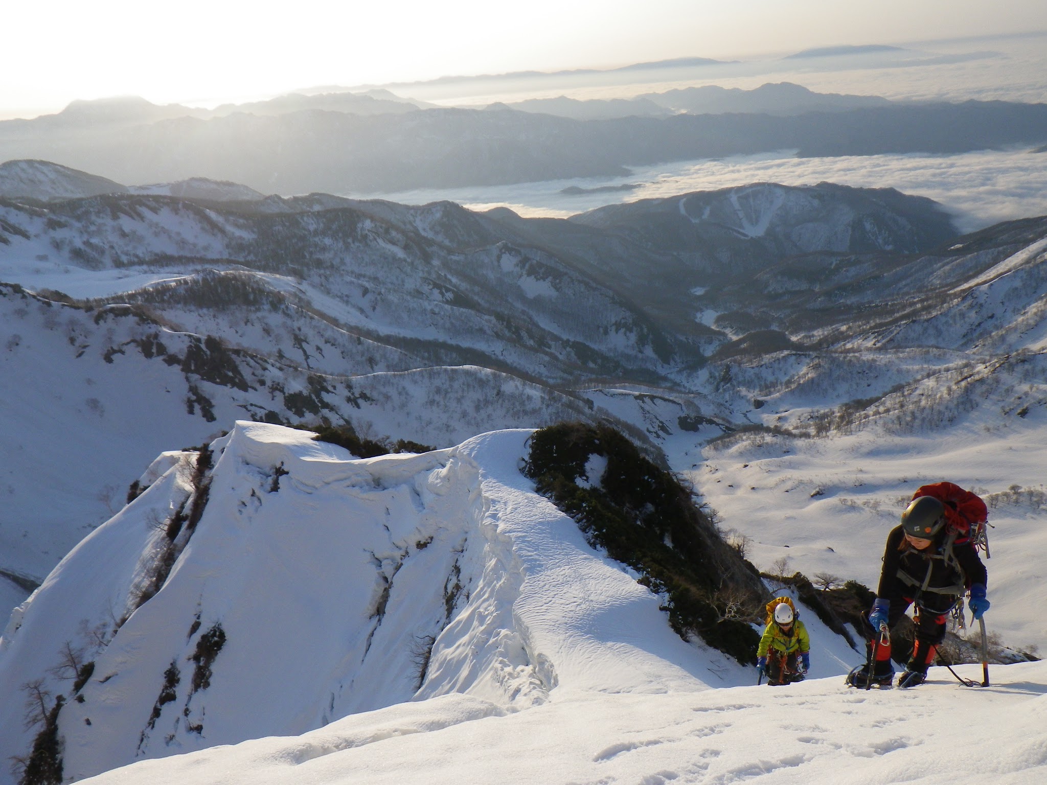 傾斜が緩やかなので、朝日を振り返りながら、高度を上げていく。そして、いよいよナイフリッジと雪壁が交互に出てくるようになった。雪の状態が良いので、時折下をのぞき込みながら雪稜歩きを楽しむ。