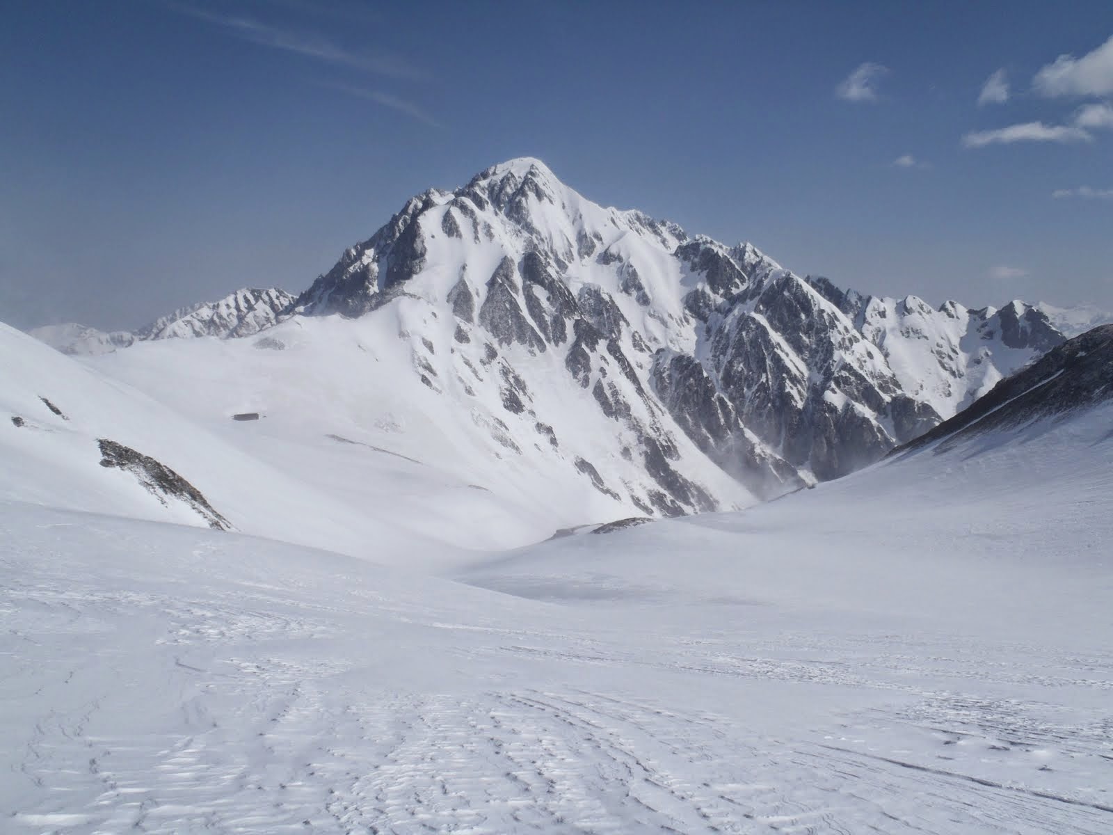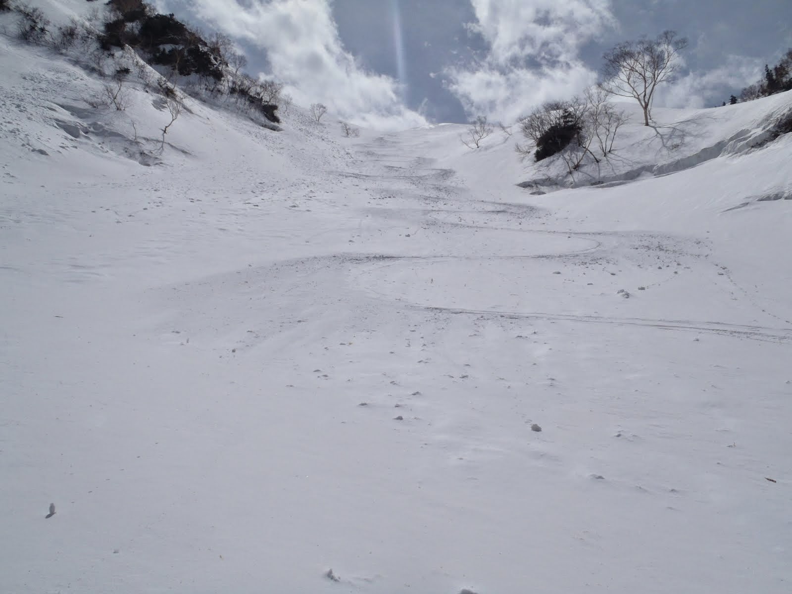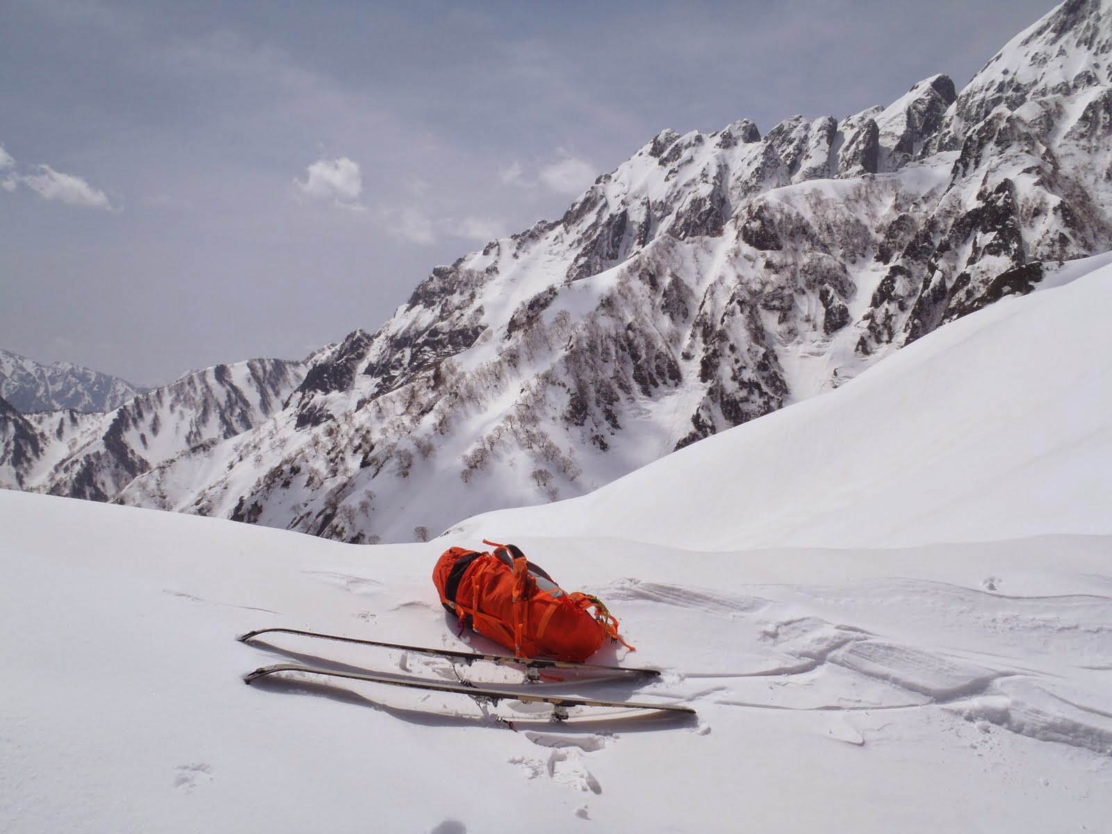 大窓の雪庇は、中央左寄りの弱点を難なくシールで越えることができた。急いで準備し、風で堅くなり始めた中仙人谷に滑り込む。傾斜は35~部分的に40°程あるが、雪質が良く幅も広いので全然怖くない。快適に滑ってあっという間に三俣。