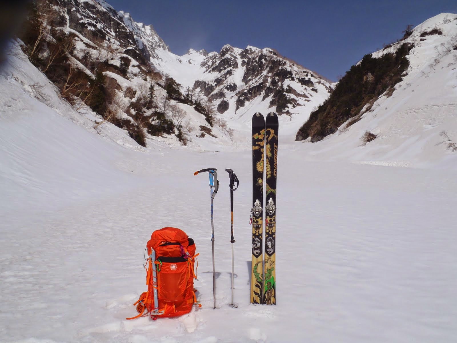 結局、小黒部谷よりも谷幅が広くて、核心部の標高も若干高い白萩川なら、多少沢が割れていても通過できそうと思われたことから(地形的に側面に巻けそうだし)、大窓から中仙人谷を滑ることとする。