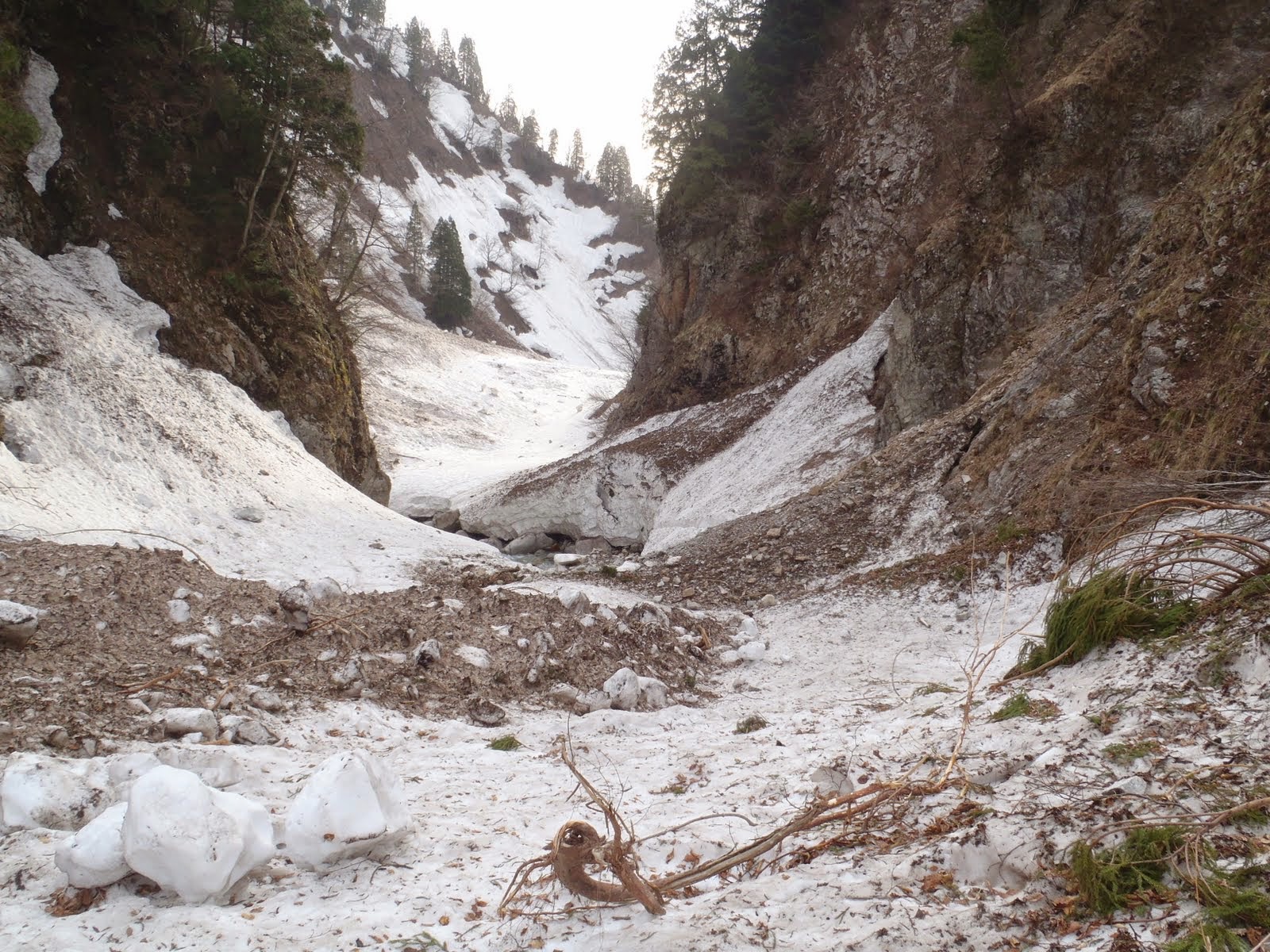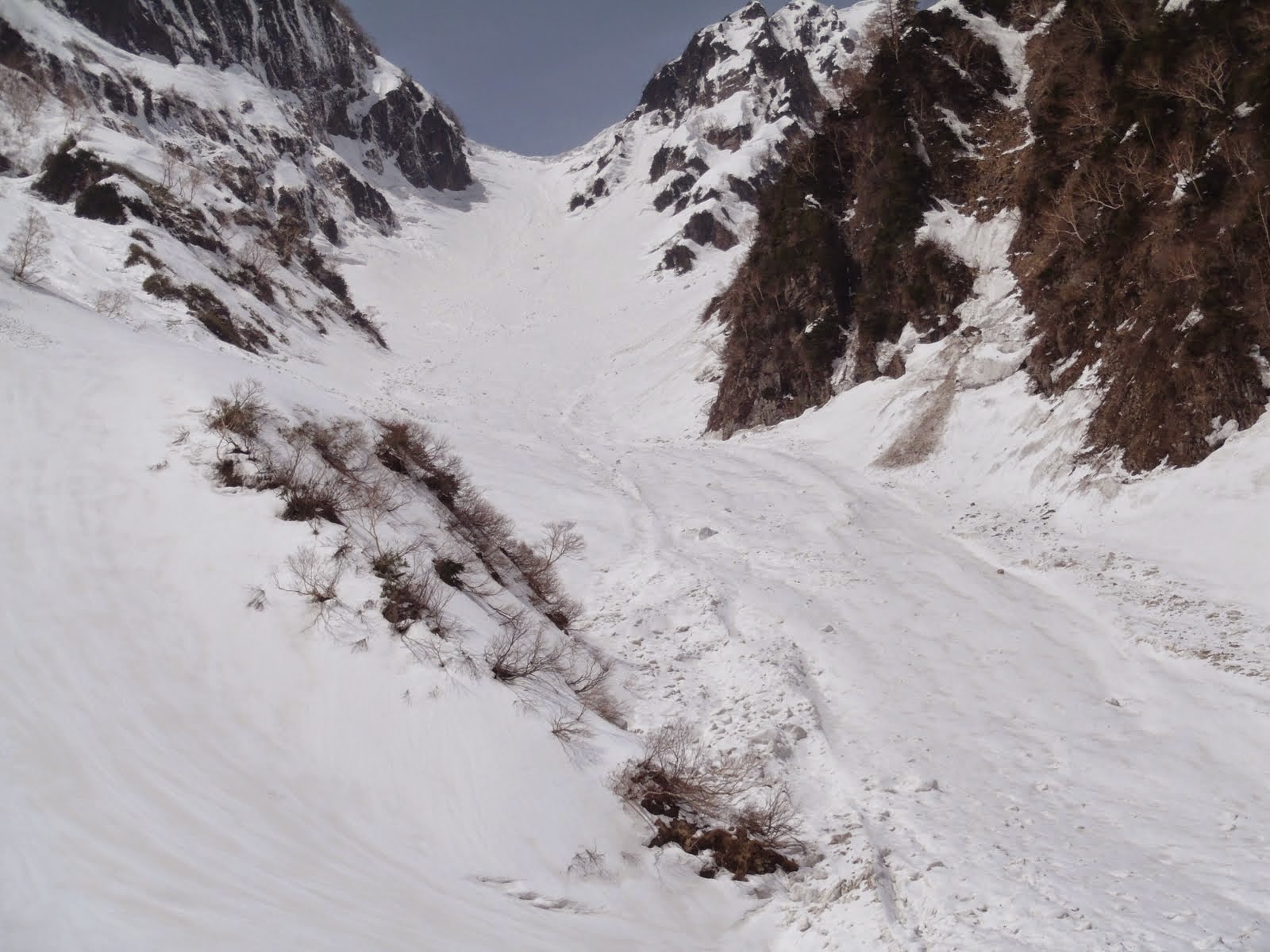 ・残雪は山の上では少な目(特に稜線近くは少ない)。麓では大目。なお谷沿いはやや大目だが、4月上旬以降の雨の影響で土砂交じりの雪崩跡&沢割れ多し。