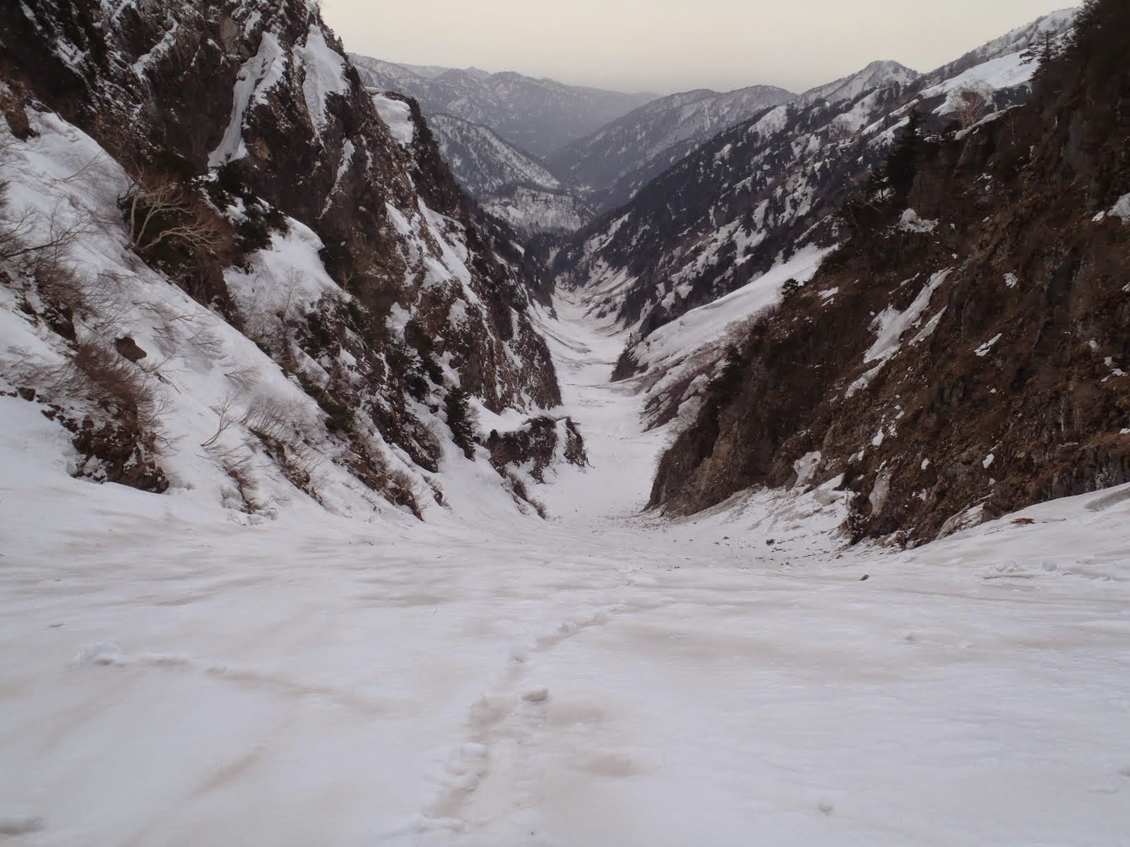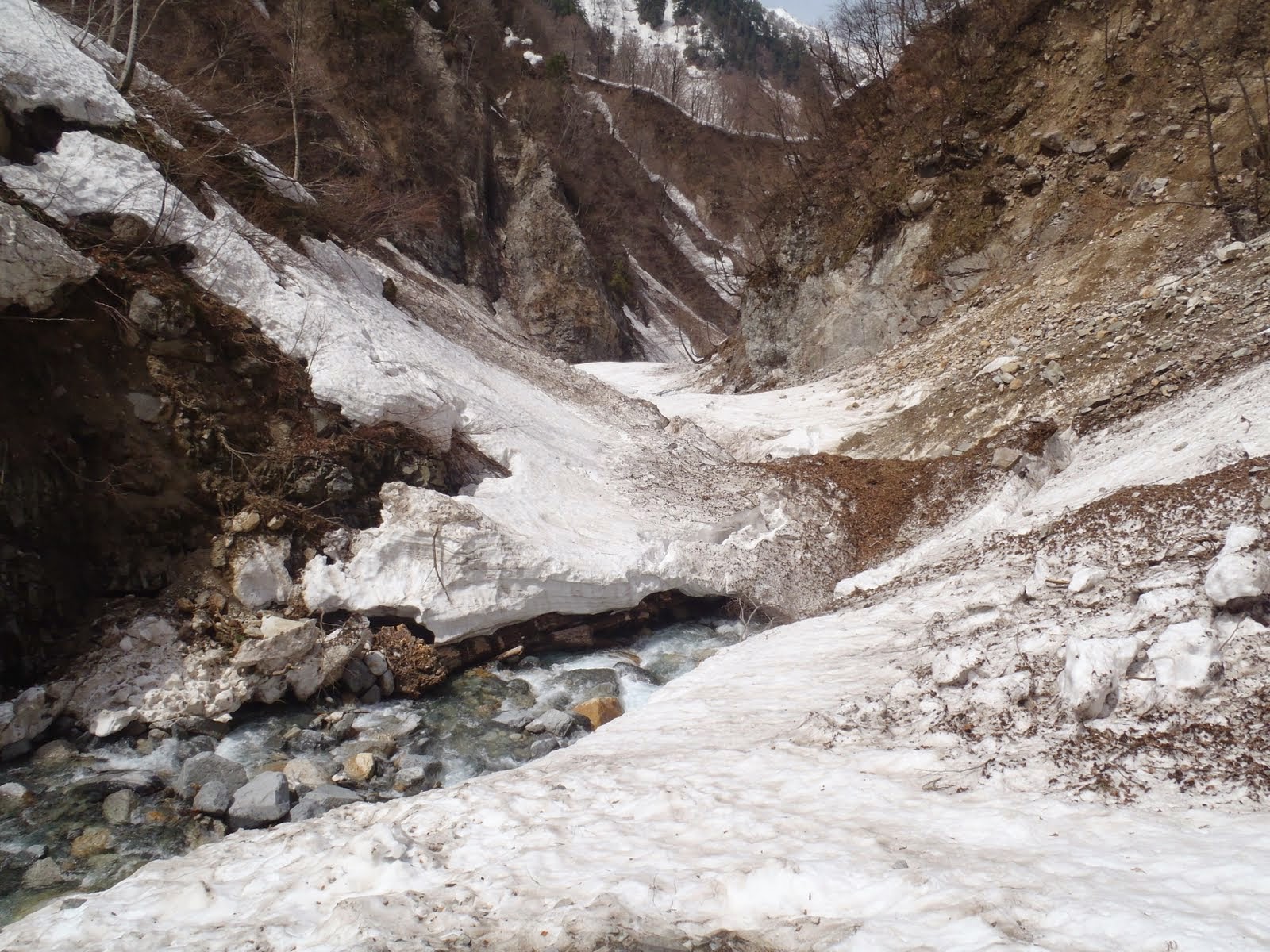 ここからは傾斜の落ちた谷をのんびりとクルージング。鷹のスワリのゴルジュも、スキーは脱いだがなんとか雪をつないで突破できた。あとは左岸沿いに滑り、馬場島派出所まで。警備隊にあいさつ後、運動靴でゲートまで下山した。