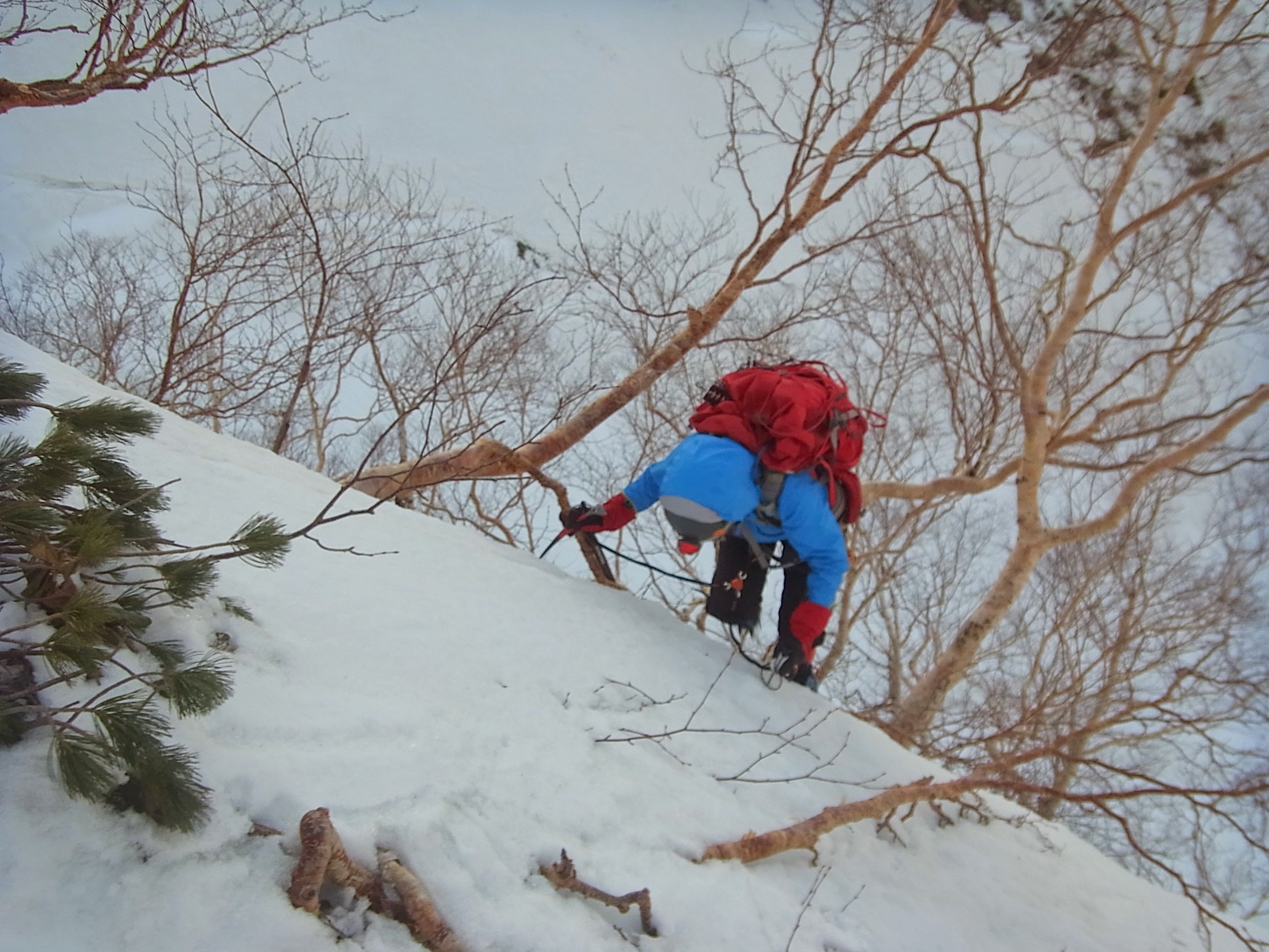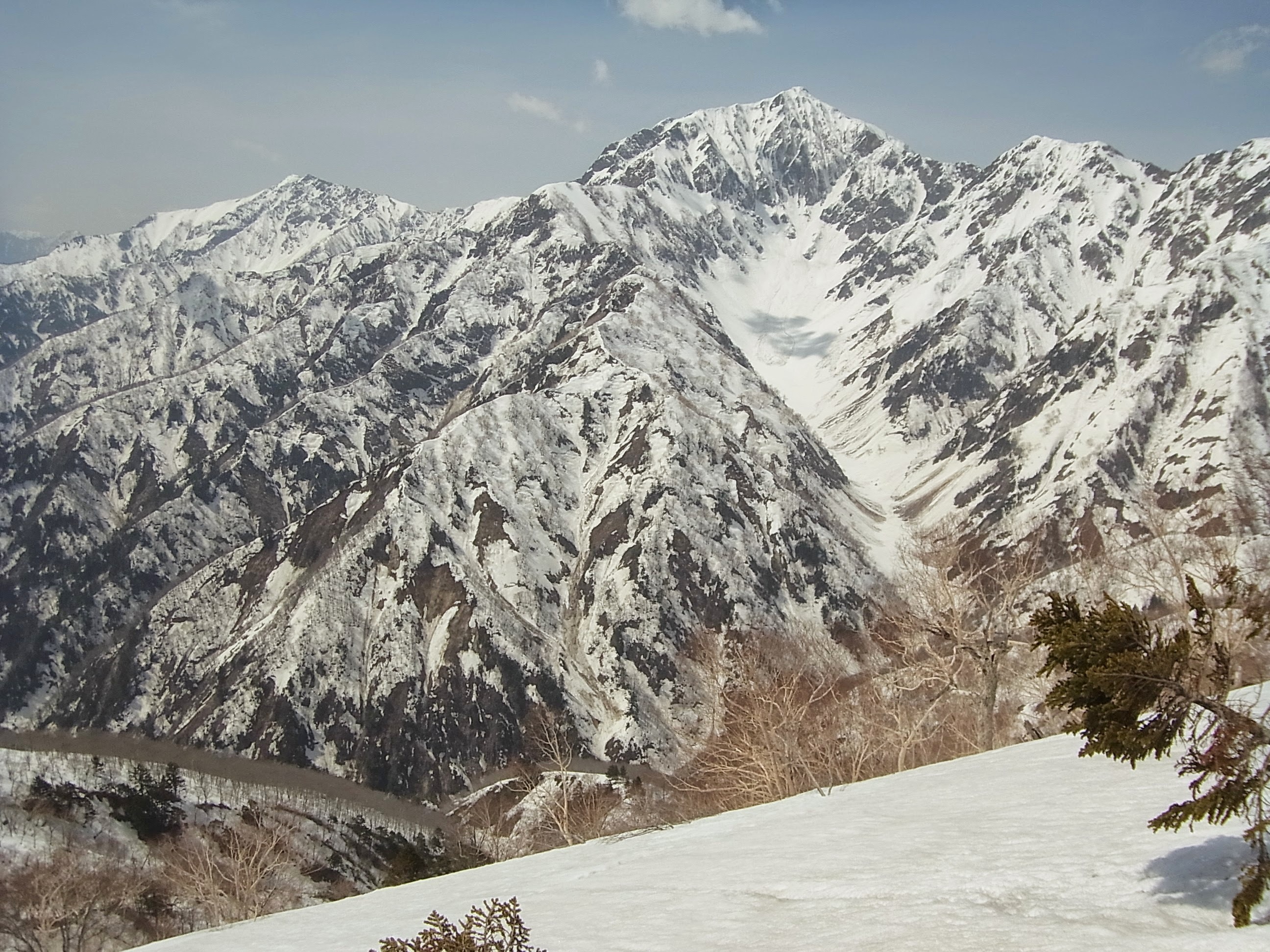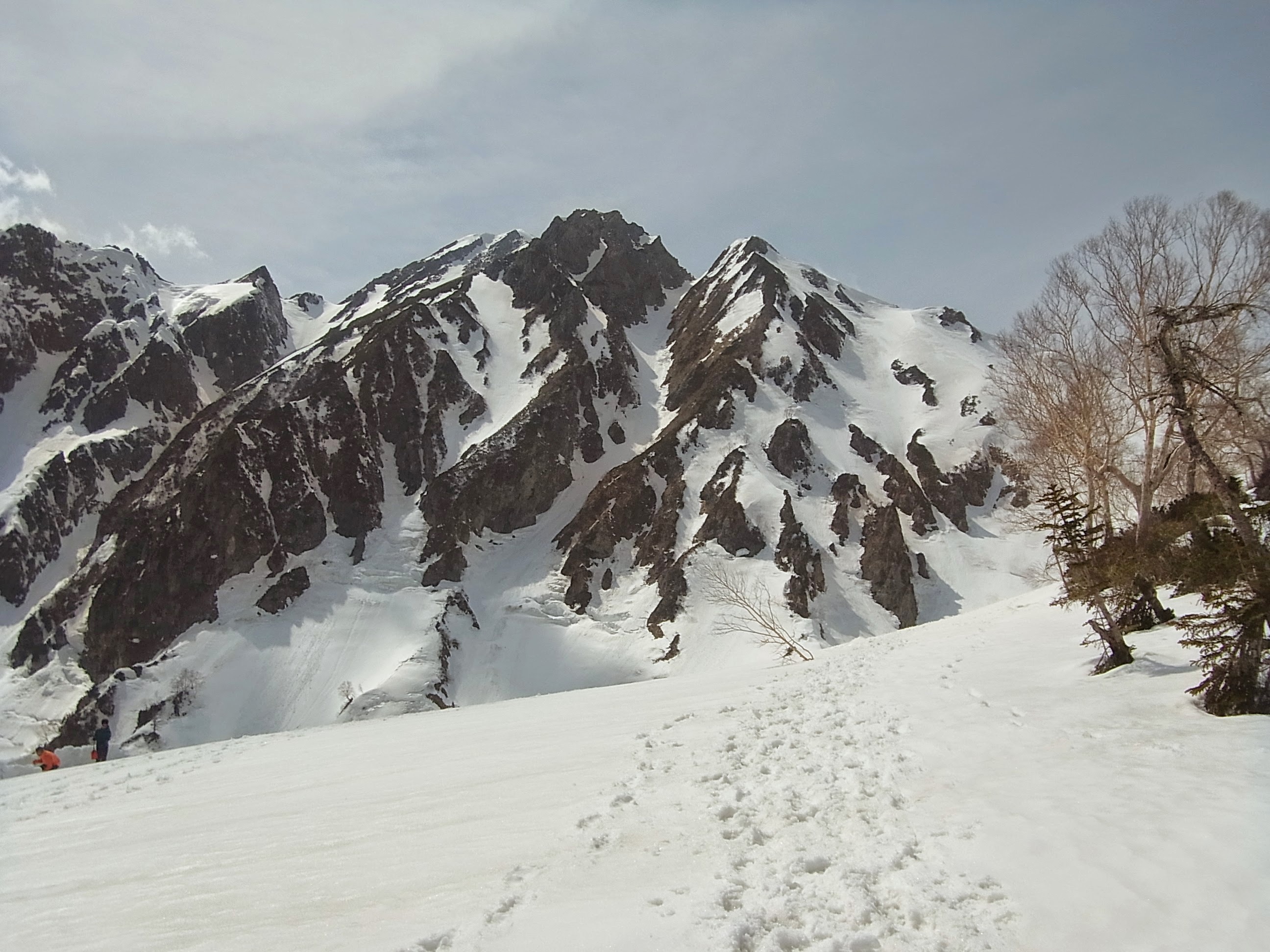 今回は、少ない雪をつないでできるだけ上部まで登り、シュルンドが現われ雪も腐りはじめた頃に、G0稜線にのった形です。G0稜線上は、ハイマツとダケカンバと低木のヤブで、あまり雪稜ではありませんでした。