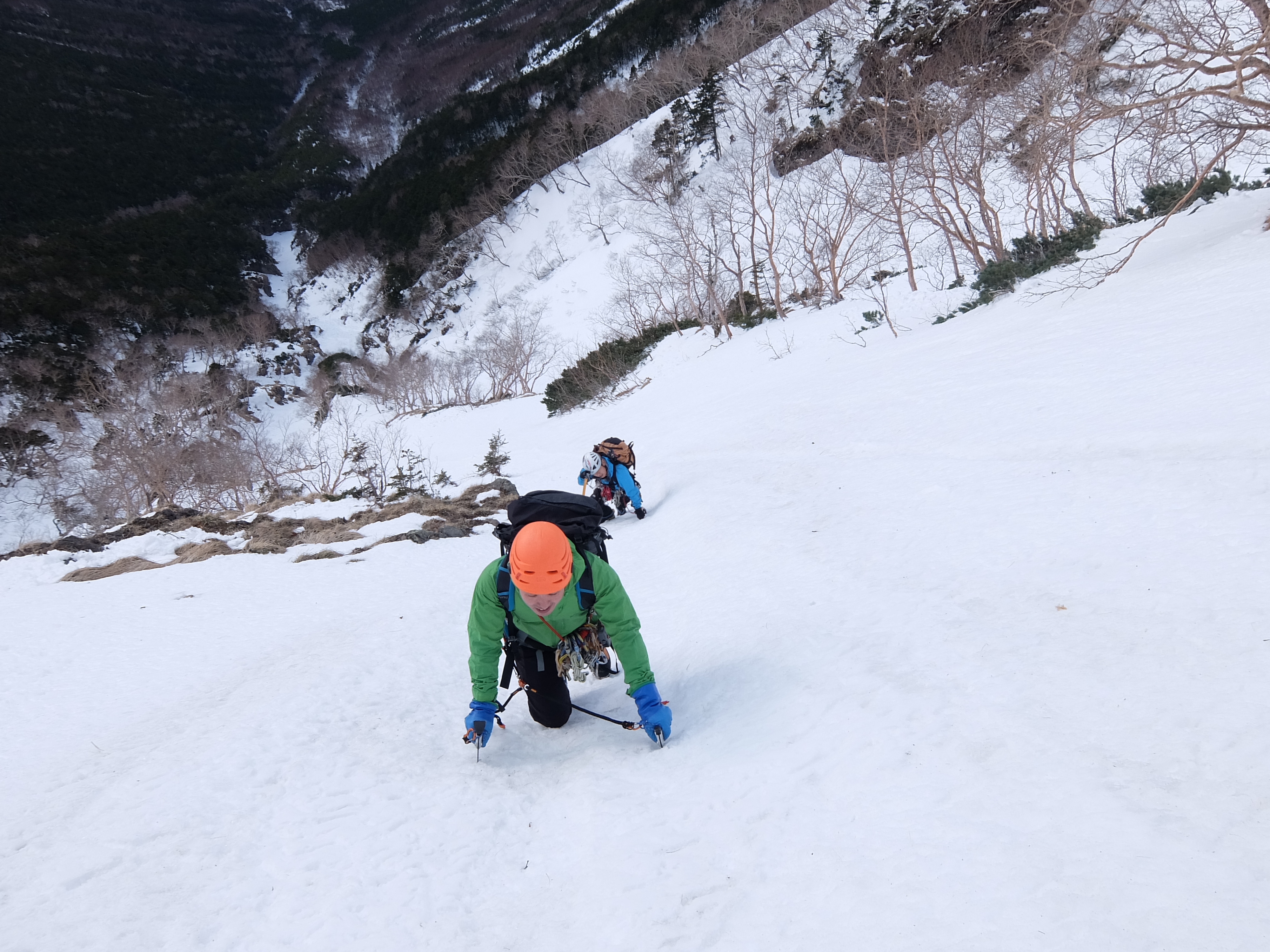 雪のリッジを進み、3mほどのスラブの岩を嫌って左の崖側にある木の間を登る。その後は木が生えた雪稜を進み、草付き5m斜面を抜けたところでロープいっぱいでピッチを切る。