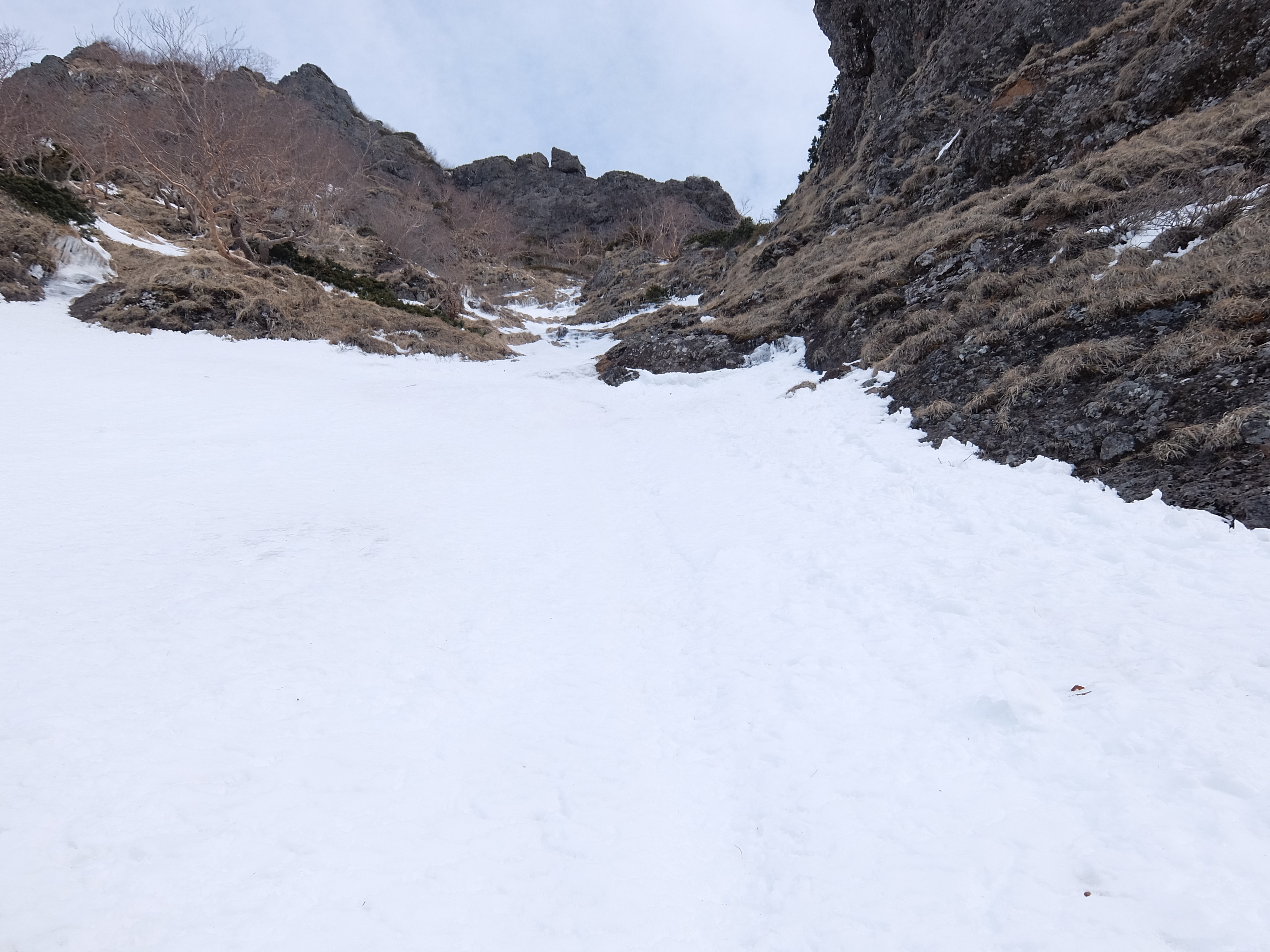 3ピッチ目終了点から奥壁基部まで、木が生えていない緩い雪斜面を登る。30m