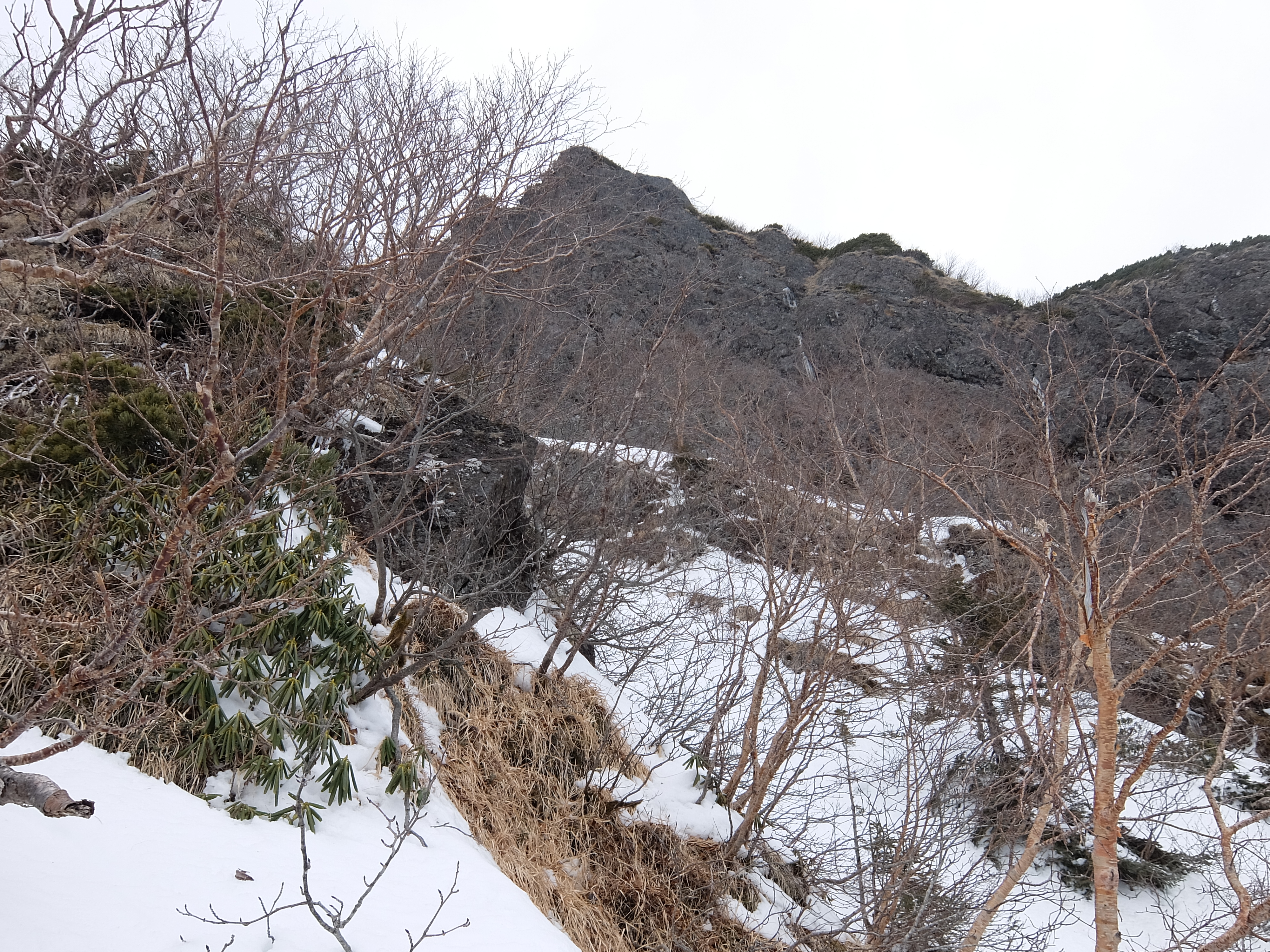 高度感ある雪のリッジを5m進んだ後、正面の岩稜を避けて左のブッシュに進路を取る。グサグサ雪のハイマツ帯を、ひたすら掻き分けながら登っていく。