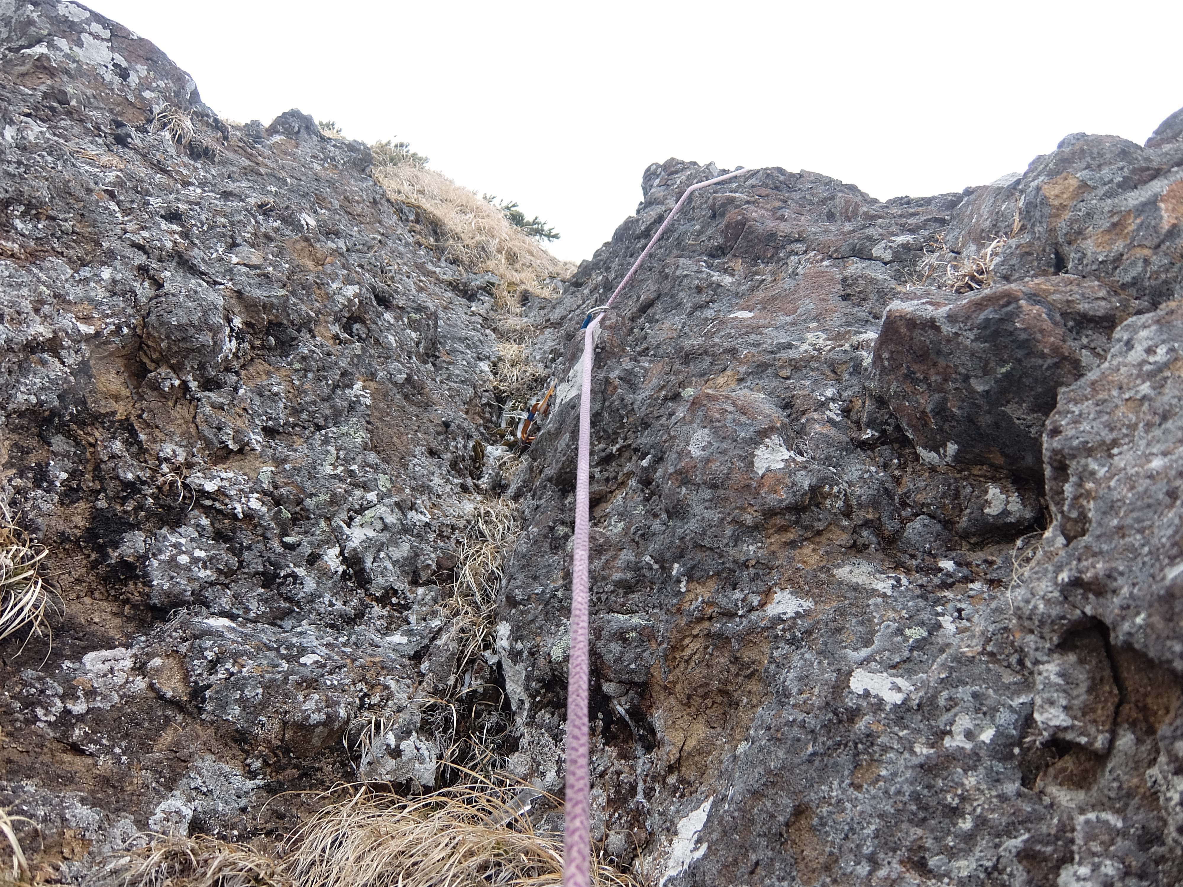 ピンは期待できない、つうかナシ。ガバを目指すも火山特有の脆さで、正面突破。