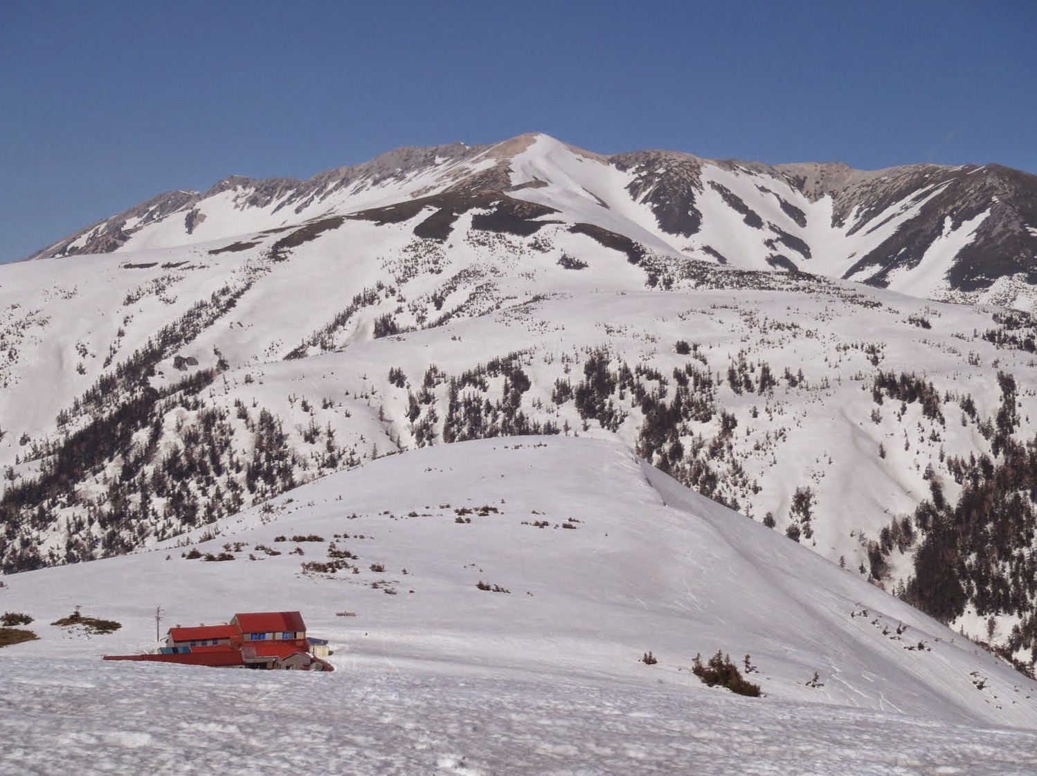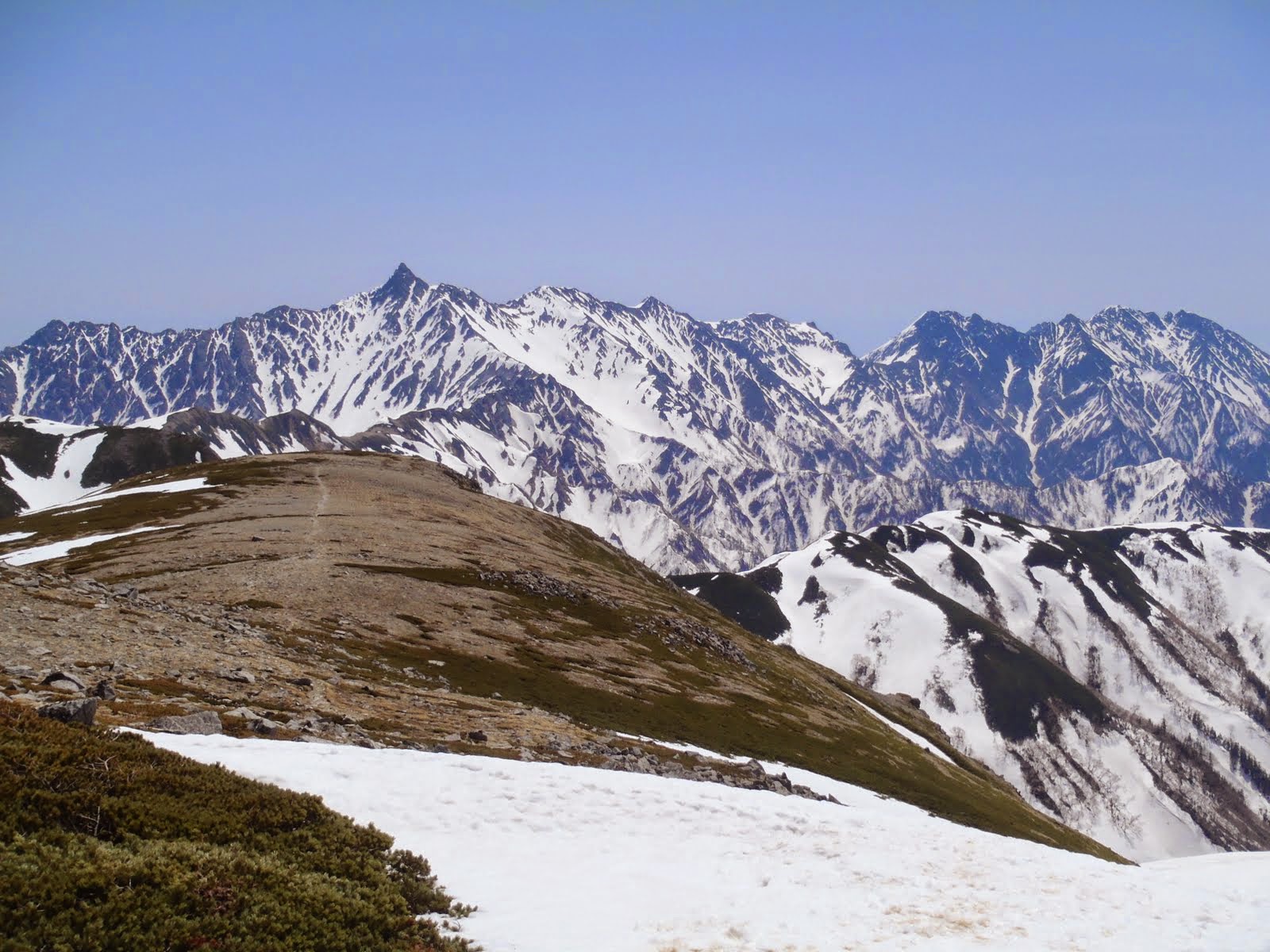 ここは毎年通いなれたコース。寺地山から一瞬スキー滑走した以外は、ひたすらシール歩行で飛ばす。それにしても、遠くに望まれる主稜線沿いは雪が少ない。案の定、北ノ俣岳の最後の登りではハイマツ登山道が露出していてシートラーゲン。北ノ俣岳の肩から望む北アルプス最奥部も雪が少ない。。 ひと滑りで営業初日の太郎平小屋着。