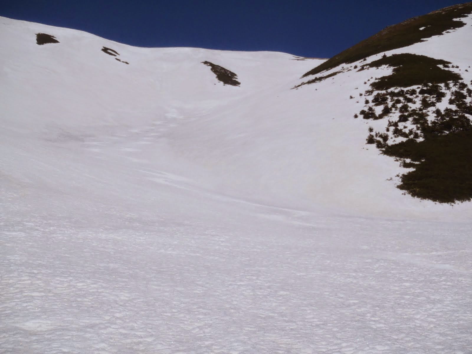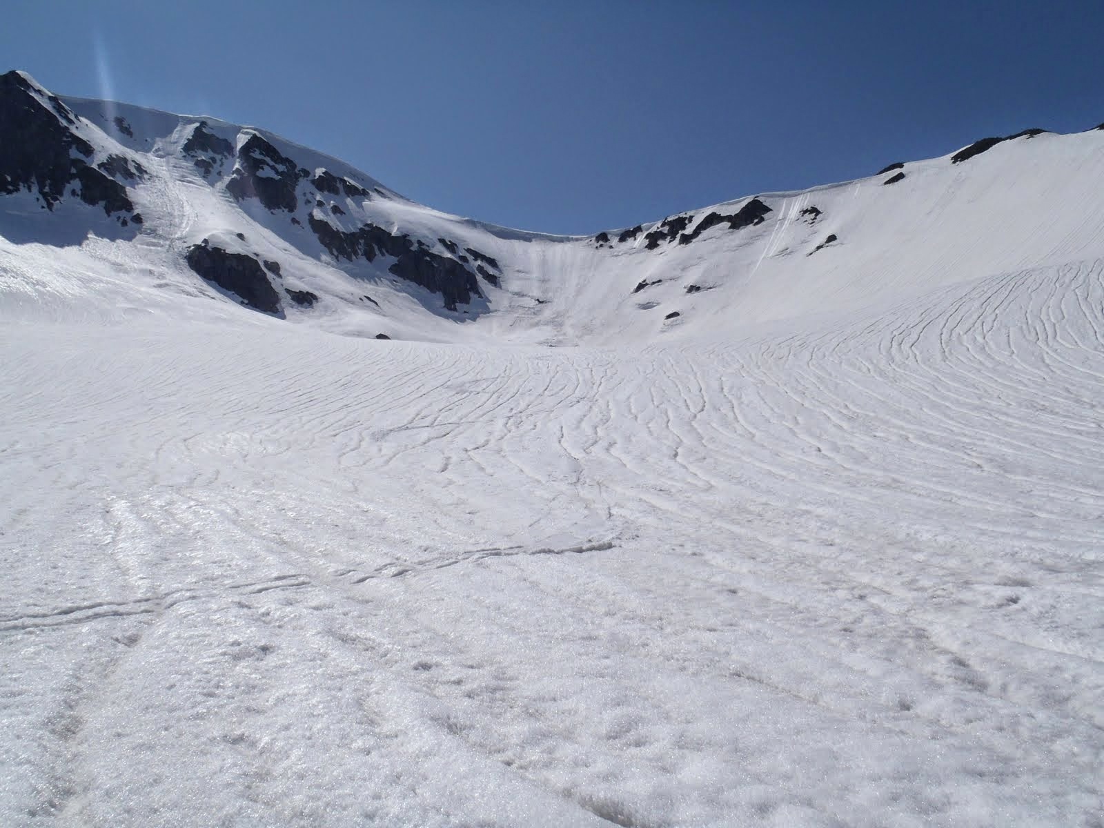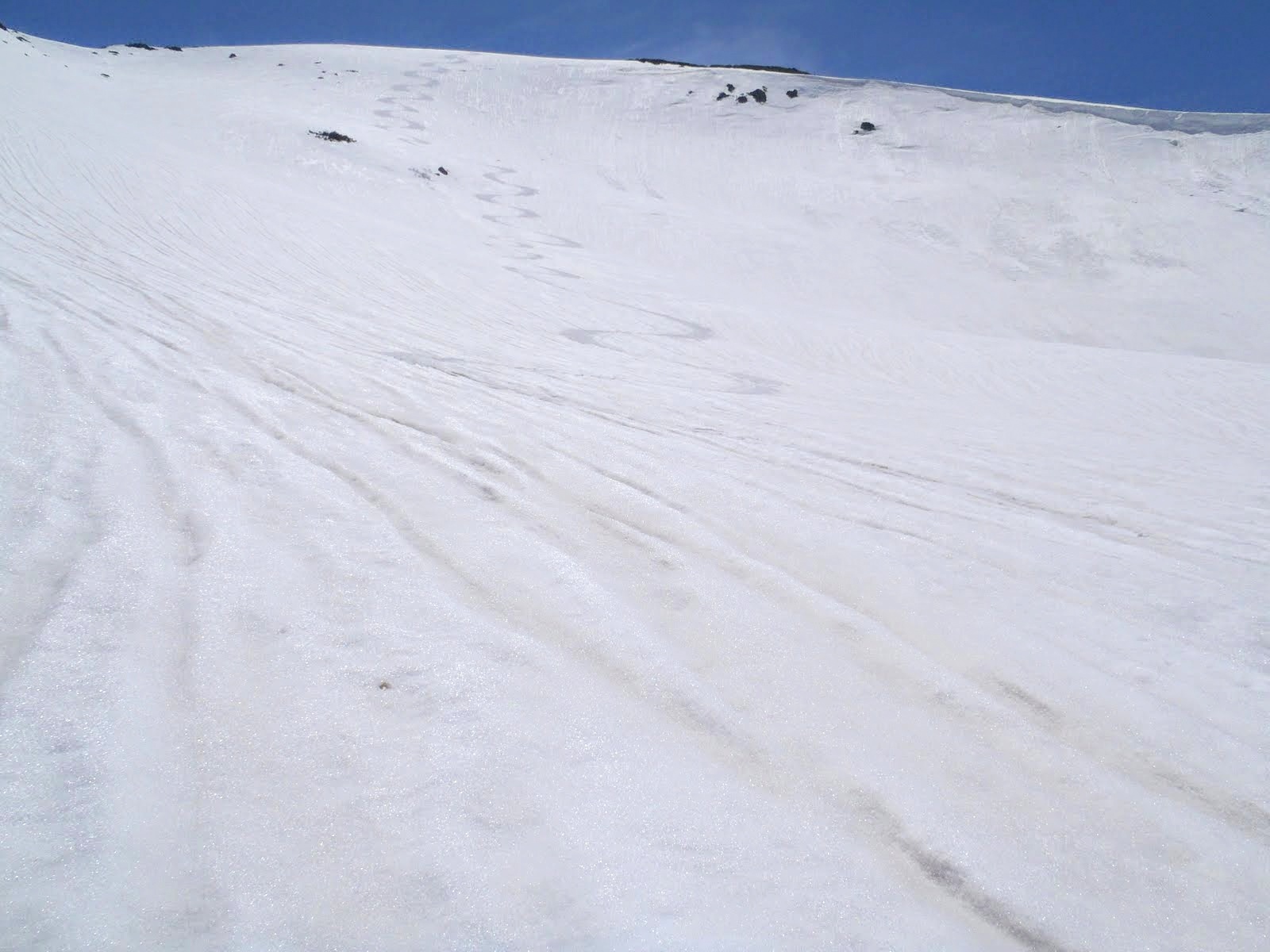 頂上到着後、まずはいつもの岬状(頂上から金作谷・中央カール中間尾根を100m弱下った個所)で金作谷出合のSBを観察するが、やはり真ん中がザックリと割れている。目指す中央カール出合の状況は頂上付近からはわからないので、その上流と下流の状況から推測するしかないが、横断できる可能性は低いと判断。