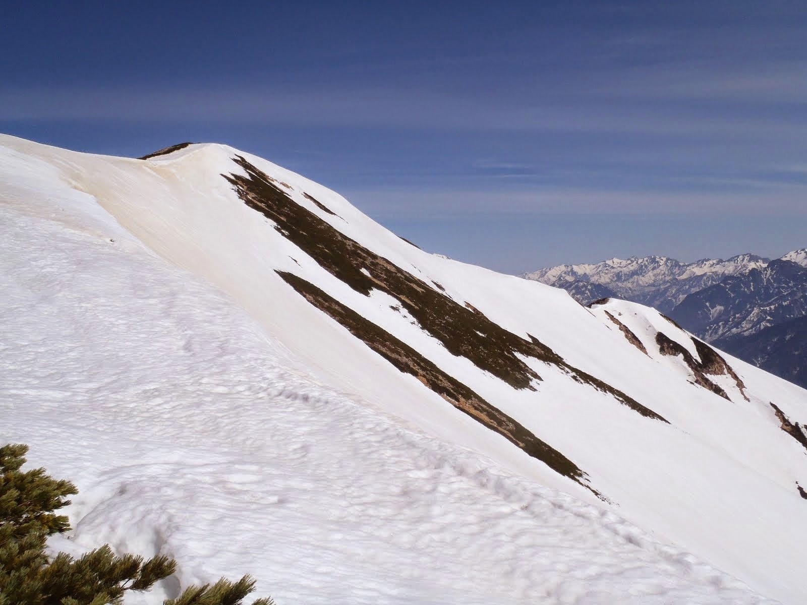 若旦那に見送られて出発。薬師岳までの稜線も西面は雪が少ないが、何とか雪の残っている東面側をシールで歩行できた。頂上直前のみシートラーゲン。