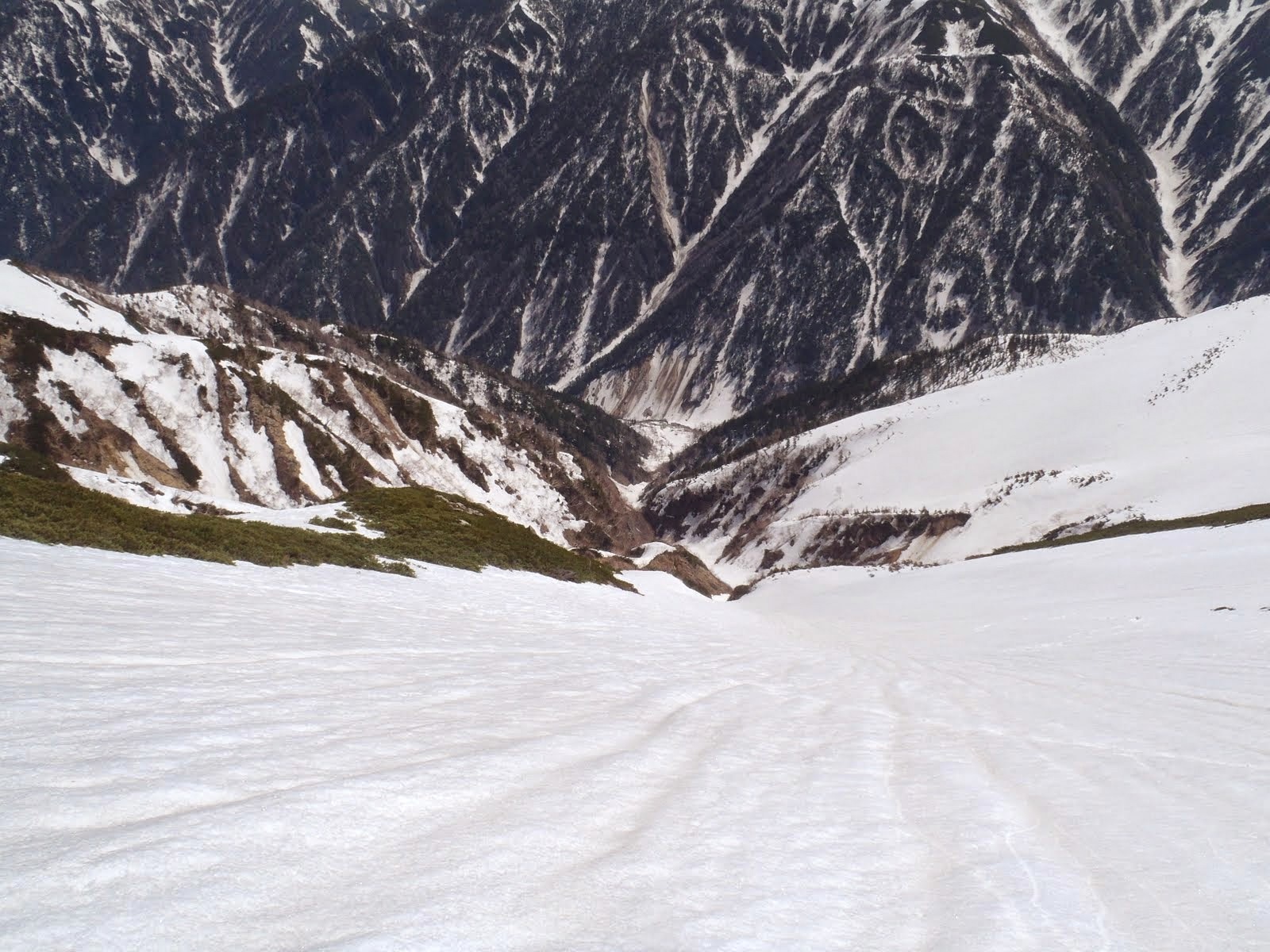 だめもとで様子をうかがいに中央カールに滑り込む。カールの底から出合を伺うが、やはり谷が蛇行しているので出合付近まで滑ってみないと状況はわからない模様。出合まで降りてから、渡れずに登り返すのは嫌だな~