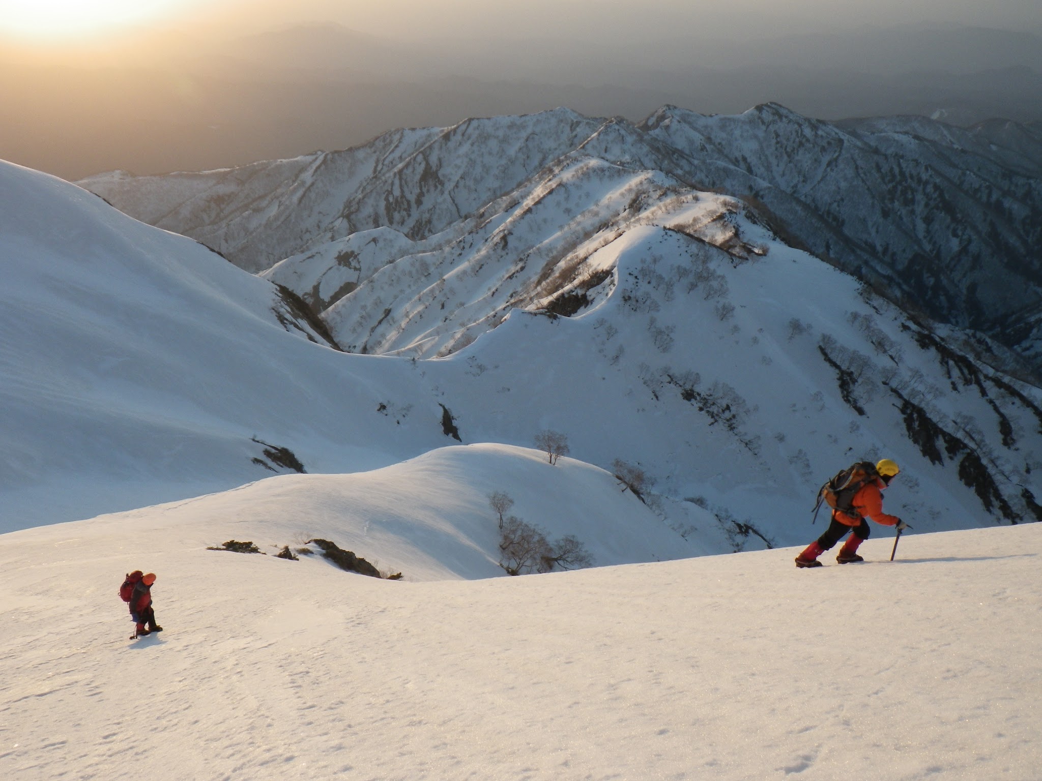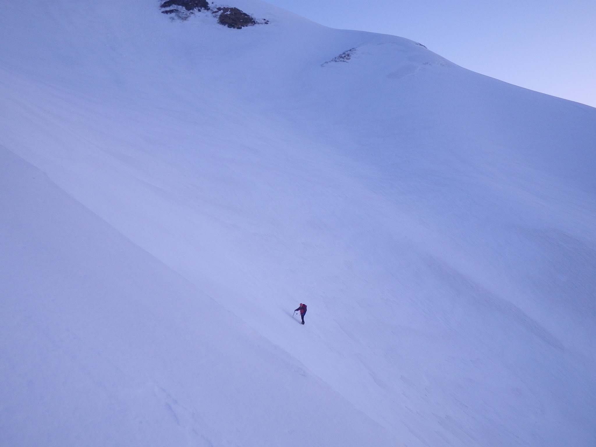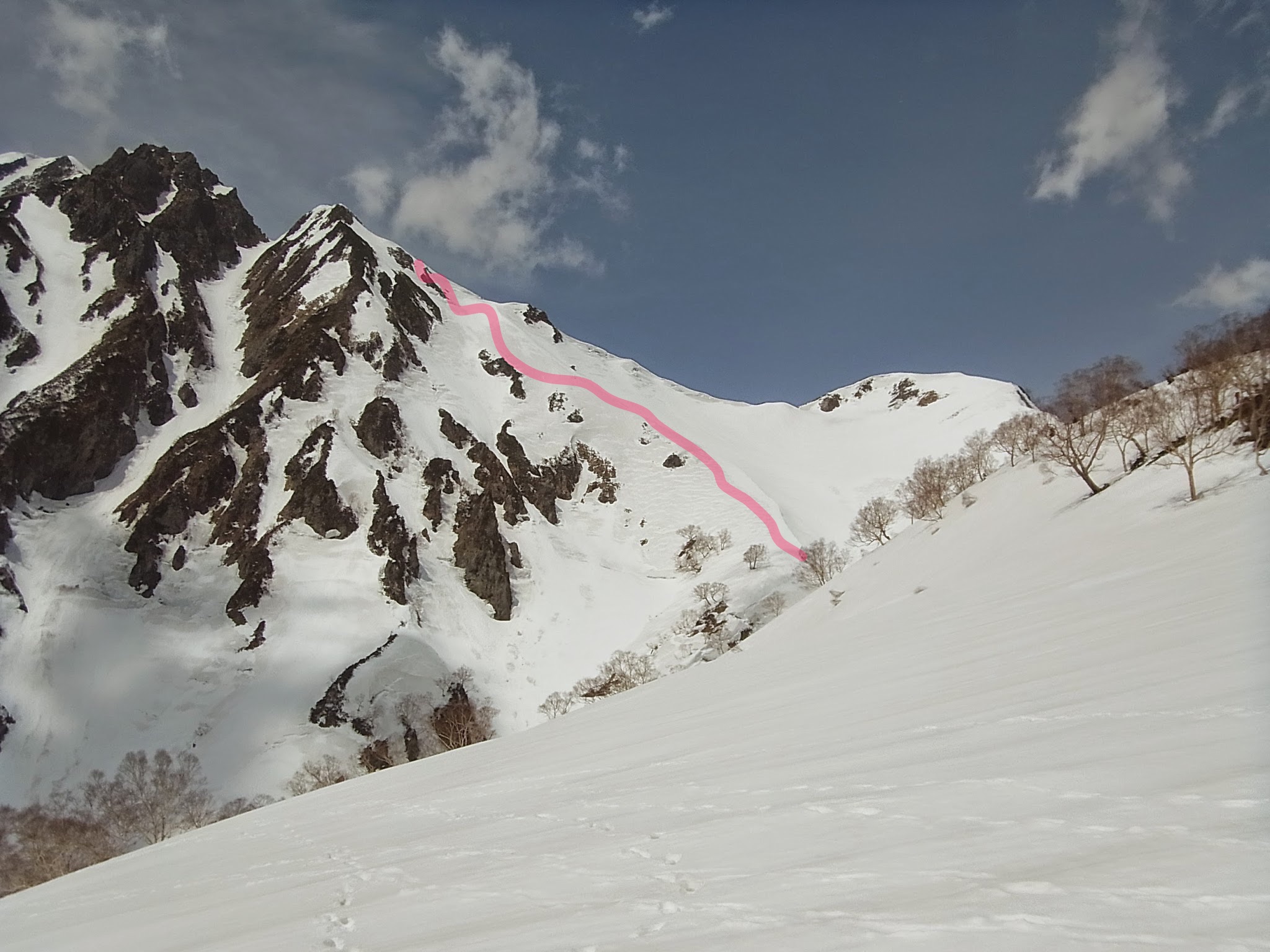 事前に予定したわけではなく見渡せば、いろいろともうヤブヤブ。頂上に向かう際、白岳から目を逸らすと雪の美しいオープンバーンに頂稜に向けての一筋のショートカットのライン。自然と足が向かってしまった。