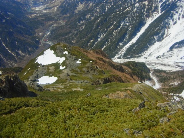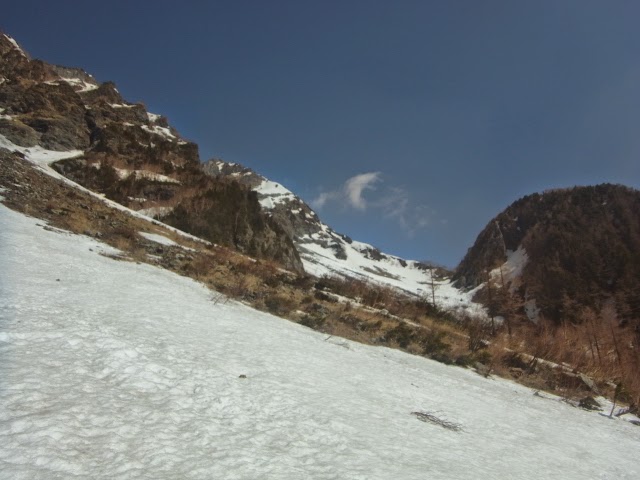 開山祭前とあって、カッパ橋も落ちついた雰囲気。見上げる穂高は見るからに雪が少ない。宮川のコルまでは夏道、時々雪渓。そこからひょうたん池までが意外と遠くしんどかった。このルート、積雪期の雪崩リスクは相当なものと実感。