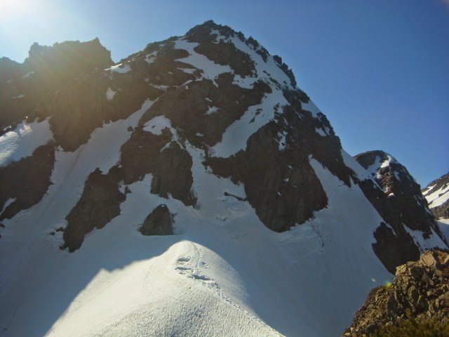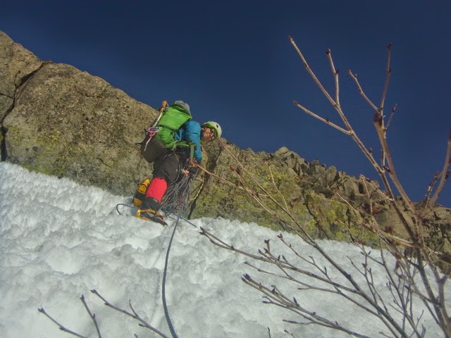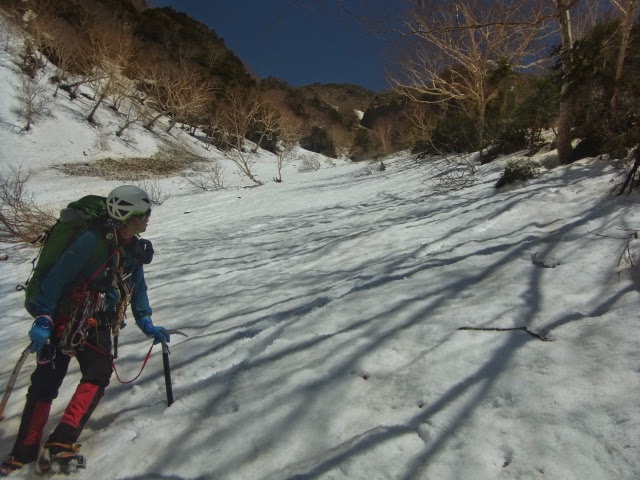 主稜線はほぼ雪が無く、ガレた斜面の踏み後を辿りコルへ。Ⅱ峰は正面左の凹角を1ピッチ。