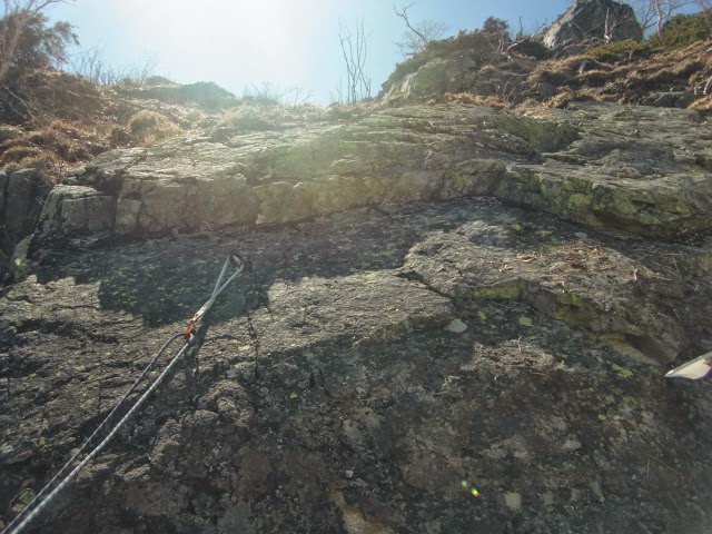 尾根に乗り、第一階段までの間にM中さんのカメラが紛失。GW中に拾われて届けられることを祈る。第一階段の1ピッチ目はややたっている。残地ハーケンあり。
