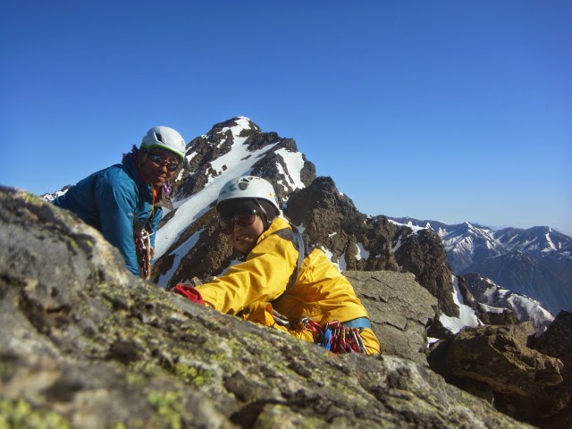 朝はテント内が凍っていた。5:50出発。快晴。正面左の雪面をつめ一枚岩のフェイス前まで1ピッチ。核心といわれるフェイスは近づくとそれほど斜度は無く、残地ハーケンが豊富。最後がやや難しい。一枚岩の終りに新しいスリングで支点が作られていたのでそこで切った。その後はやさしいが念のためつるべで2ピッチ伸ばし、頂上直下に。